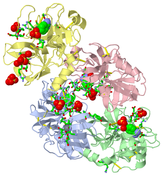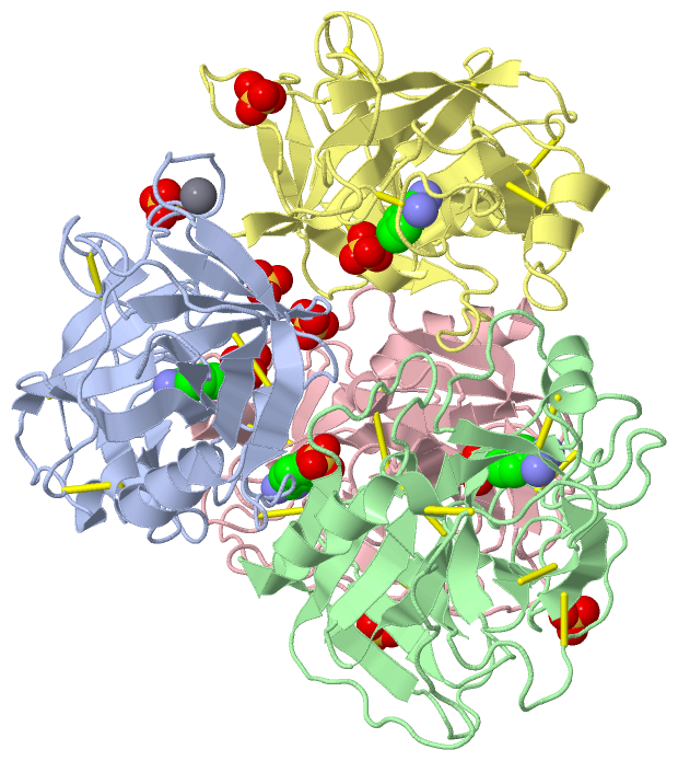 Asymmetric UnitChain A from PDB Type:PROTEIN Length:223 aligned with TRY3_SALSA | P35033 from UniProtKB/Swiss-Prot Length:238 Alignment length:223 25 35 45 55 65 75 85 95 105 115 125 135 145 155 165 175 185 195 205 215 225 235 TRY3_SALSA 16 IVGGYECRKNSASYQASLQSGYHFCGGSLISSTWVVSAAHCYKSRIQVRLGEHNIAVNEGTEQFIDSVKVIMHPSYNSRNLDNDIMLIKLSKPASLNSYVSTVALPSSCASSGTRCLVSGWGNLSGSSSNYPDTLRCLDLPILSSSSCNSAYPGQITSNMFCAGFMEGGKDSCQGDSGGPVVCNGQLQGVVSWGYGCAQRNKPGVYTKVCNYRSWISSTMSSN 238 SCOP domains d1a0ja_ A: Trypsin(ogen) SCOP domains CATH domains 1a0jA01 1a0jA02 A:28-120,A:233-245 Trypsin-like serine proteases 1a0jA01 A:16-27,A:121-232 Trypsin-like serine proteases 1a0jA02 CATH domains Pfam domains ------------------------------------------------------------------------------------------------------------------------------------------------------------------------------------------------------------------------------- Pfam domains SAPs(SNPs) ------------------------------------------------------------------------------------------------------------------------------------------------------------------------------------------------------------------------------- SAPs(SNPs) PROSITE (1) TRYPSIN_DOM PDB: A:16-243 UniProt: 16-236 -- PROSITE (1) PROSITE (2) -----------------------------------TRYPSI---------------------------------------------------------------------------------------------------------------------------------TRYPSIN_SER ----------------------------------------- PROSITE (2) Transcript ------------------------------------------------------------------------------------------------------------------------------------------------------------------------------------------------------------------------------- Transcript 1a0j A 16 IVGGYECRKNSASYQASLQSGYHFCGGSLISSTWVVSAAHCYKSRIQVRLGEHNIAVNEGTEQFIDSVKVIMHPSYNSRNLDNDIMLIKLSKPASLNSYVSTVALPSSCASSGTRCLVSGWGNLSGSSSNYPDTLRCLDLPILSSSSCNSAYPGQITSNMFCAGFMEGGKDSCQGDSGGPVVCNGQLQGVVSWGYGCAQRNKPGVYTKVCNYRSWISSTMSSN 245 25 37 47 57 67| 78 88 98 108 118 |129|| 140 150 160 170 180 | 188A 198 ||212 || 222 232 242 34| 67| 125| || 184A 188A 204| 217| | 37 69 127 || 209 219 | 130| 221A 132 Chain B from PDB Type:PROTEIN Length:223 aligned with TRY3_SALSA | P35033 from UniProtKB/Swiss-Prot Length:238 Alignment length:223 25 35 45 55 65 75 85 95 105 115 125 135 145 155 165 175 185 195 205 215 225 235 TRY3_SALSA 16 IVGGYECRKNSASYQASLQSGYHFCGGSLISSTWVVSAAHCYKSRIQVRLGEHNIAVNEGTEQFIDSVKVIMHPSYNSRNLDNDIMLIKLSKPASLNSYVSTVALPSSCASSGTRCLVSGWGNLSGSSSNYPDTLRCLDLPILSSSSCNSAYPGQITSNMFCAGFMEGGKDSCQGDSGGPVVCNGQLQGVVSWGYGCAQRNKPGVYTKVCNYRSWISSTMSSN 238 SCOP domains d1a0jb_ B: Trypsin(ogen) SCOP domains CATH domains 1a0jB01 1a0jB02 B:28-120,B:233-245 Trypsin-like serine proteases 1a0jB01 B:16-27,B:121-232 Trypsin-like serine proteases 1a0jB02 CATH domains Pfam domains ------------------------------------------------------------------------------------------------------------------------------------------------------------------------------------------------------------------------------- Pfam domains SAPs(SNPs) ------------------------------------------------------------------------------------------------------------------------------------------------------------------------------------------------------------------------------- SAPs(SNPs) PROSITE (1) TRYPSIN_DOM PDB: B:16-243 UniProt: 16-236 -- PROSITE (1) PROSITE (2) -----------------------------------TRYPSI---------------------------------------------------------------------------------------------------------------------------------TRYPSIN_SER ----------------------------------------- PROSITE (2) Transcript ------------------------------------------------------------------------------------------------------------------------------------------------------------------------------------------------------------------------------- Transcript 1a0j B 16 IVGGYECRKNSASYQASLQSGYHFCGGSLISSTWVVSAAHCYKSRIQVRLGEHNIAVNEGTEQFIDSVKVIMHPSYNSRNLDNDIMLIKLSKPASLNSYVSTVALPSSCASSGTRCLVSGWGNLSGSSSNYPDTLRCLDLPILSSSSCNSAYPGQITSNMFCAGFMEGGKDSCQGDSGGPVVCNGQLQGVVSWGYGCAQRNKPGVYTKVCNYRSWISSTMSSN 245 25 37 47 57 67| 78 88 98 108 118 |129|| 140 150 160 170 180 | 188A 198 ||212 || 222 232 242 34| 67| 125| || 184A 188A 204| 217| | 37 69 127 || 209 219 | 130| 221A 132 Chain C from PDB Type:PROTEIN Length:223 aligned with TRY3_SALSA | P35033 from UniProtKB/Swiss-Prot Length:238 Alignment length:223 25 35 45 55 65 75 85 95 105 115 125 135 145 155 165 175 185 195 205 215 225 235 TRY3_SALSA 16 IVGGYECRKNSASYQASLQSGYHFCGGSLISSTWVVSAAHCYKSRIQVRLGEHNIAVNEGTEQFIDSVKVIMHPSYNSRNLDNDIMLIKLSKPASLNSYVSTVALPSSCASSGTRCLVSGWGNLSGSSSNYPDTLRCLDLPILSSSSCNSAYPGQITSNMFCAGFMEGGKDSCQGDSGGPVVCNGQLQGVVSWGYGCAQRNKPGVYTKVCNYRSWISSTMSSN 238 SCOP domains d1a0jc_ C: Trypsin(ogen) SCOP domains CATH domains 1a0jC01 1a0jC02 C:28-120,C:233-245 Trypsin-like serine proteases 1a0jC01 C:16-27,C:121-232 Trypsin-like serine proteases 1a0jC02 CATH domains Pfam domains ------------------------------------------------------------------------------------------------------------------------------------------------------------------------------------------------------------------------------- Pfam domains SAPs(SNPs) ------------------------------------------------------------------------------------------------------------------------------------------------------------------------------------------------------------------------------- SAPs(SNPs) PROSITE (1) TRYPSIN_DOM PDB: C:16-243 UniProt: 16-236 -- PROSITE (1) PROSITE (2) -----------------------------------TRYPSI---------------------------------------------------------------------------------------------------------------------------------TRYPSIN_SER ----------------------------------------- PROSITE (2) Transcript ------------------------------------------------------------------------------------------------------------------------------------------------------------------------------------------------------------------------------- Transcript 1a0j C 16 IVGGYECR