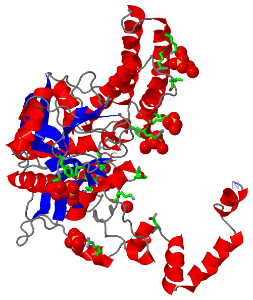 Asymmetric UnitChain A from PDB Type:PROTEIN Length:459 aligned with BLH1_YEAST | Q01532 from UniProtKB/Swiss-Prot Length:483 Alignment length:470 23 33 43 53 63 73 83 93 103 113 123 133 143 153 163 173 183 193 203 213 223 233 243 253 263 273 283 293 303 313 323 333 343 353 363 373 383 393 403 413 423 433 443 453 463 473 483 BLH1_YEAST 14 TFRSHLLRAPQIVLKRMSSSIDISKINSWNKEFQSDLTHQLATTVLKNYNADDALLNKTRLQKQDNRVFNTVVSTDSTPVTNQKSSGRCWLFAATNQLRLNVLSELNLKEFELSQAYLFFYDKLEKANYFLDQIVSSADQDIDSRLVQYLLAAPTEDGGQYSMFLNLVKKYGLIPKDLYGDLPYSTTASRKWNSLLTTKLREFAETLRTALKERSADDSIIVTLREQMQREIFRLMSLFMDIPPVQPNEQFTWEYVDKDKKIHTIKSTPLEFASKYAKLDPSTPVSLINDPRHPYGKLIKIDRLGNVLGGDAVIYLNVDNETLSKLVVKRLQNNKAVFFGSHTPKFMDKKTGVMDIELWNYPAIGYNLPQQKASRIRYHESLMTHAMLITGCHVDETSKLPLRYRVENSWGKDSGKDGLYVMTQKYFEEYCFQIVVDINELPKELASKFTSGKEEPIVLPIWDPMGALAK 483 SCOP domains d1a6 ra_ A: Bleomycin hydrolase SCOP domains CATH domains ---------------------------------------------------------------------1a6rA01 A:54-454 Cysteine proteinases CATH domains Pfam domains -------------------------------------------------------------------------------------------------------------------------------------------------------------------------------------------------------------------------------------------------------------------------------------------------------------------------------------------------------------------------------------------------------------------------------------------------------------------------------------- Pfam domains SAPs(SNPs) -------------------------------------------------------------------------------------------------------------------------------------------------------------------------------------------------------------------------------------------------------------------------------------------------------------------------------------------------------------------------------------------------------------------------------------------------------------------------------------- SAPs(SNPs) PROSITE ----------------------------------------------------------------------------------THIOL_PROTEA------------------------------------------------------------------------------------------------------------------------------------------------------------------------------------------------------------------------------------------------------------------------------------------------THIOL_PROTE----------------------------------------------------------------------------- PROSITE Transcript -------------------------------------------------------------------------------------------------------------------------------------------------------------------------------------------------------------------------------------------------------------------------------------------------------------------------------------------------------------------------------------------------------------------------------------------------------------------------------------- Transcript 1a6r A -4 AFQG-----------AMASSIDISKINSWNKEFQSDLTHQLATTVLKNYNADDALLNKTRLQKQDNRVFNTVVSTDSTPVTNQKSSGRAWLFAATNQLRLNVLSELNLKEFELSQAYLFFYDKLEKANYFLDQIVSSADQDIDSRLVQYLLAAPTEDGGQYSMFLNLVKKYGLIPKDLYGDLPYSTTASRKWNSLLTTKLREFAETLRTALKERSADDSIIVTLREQMQREIFRLMSLFMDIPPVQPNEQFTWEYVDKDKKIHTIKSTPLEFASKYAKLDPSTPVSLINDPRHPYGKLIKIDRLGNVLGGDAVIYLNVDNETLSKLVVKRLQNNKAVFFGSHTPKFMDKKTGVMDIELWNYPAIGYNLPQQKASRIRYHESLMTHAMLITGCHVDETSKLPLRYRVENSWGKDSGKDGLYVMTQKYFEEYCFQIVVDINELPKELASKFTSGKEEPIVLPIWDPMGALAK 454 | - | 4 14 24 34 44 54 64 74 84 94 104 114 124 134 144 154 164 174 184 194 204 214 224 234 244 254 264 274 284 294 304 314 324 334 344 354 364 374 384 394 404 414 424 434 444 454 -1 0
