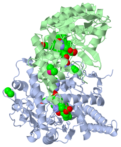 Asymmetric/Biological UnitChain A from PDB Type:PROTEIN Length:416 aligned with NOS3_BOVIN | P29473 from UniProtKB/Swiss-Prot Length:1205 Alignment length:416 76 86 96 106 116 126 136 146 156 166 176 186 196 206 216 226 236 246 256 266 276 286 296 306 316 326 336 346 356 366 376 386 396 406 416 426 436 446 456 466 476 NOS3_BOVIN 67 GPKFPRVKNWELGSITYDTLCAQSQQDGPCTPRCCLGSLVLPRKLQTRPSPGPPPAEQLLSQARDFINQYYSSIKRSGSQAHEERLQEVEAEVASTGTYHLRESELVFGAKQAWRNAPRCVGRIQWGKLQVFDARDCSSAQEMFTYICNHIKYATNRGNLRSAITVFPQRAPGRGDFRIWNSQLVRYAGYRQQDGSVRGDPANVEITELCIQHGWTPGNGRFDVLPLLLQAPDEAPELFVLPPELVLEVPLEHPTLEWFAALGLRWYALPAVSNMLLEIGGLEFSAAPFSGWYMSTEIGTRNLCDPHRYNILEDVAVCMDLDTRTTSSLWKDKAAVEINLAVLHSFQLAKVTIVDHHAATVSFMKHLDNEQKARGGCPADWAWIVPPISGSLTPVFHQEMVNYILSPAFRYQPDPW 482 SCOP domains d1dm6a_ A: Nitric oxide (NO) synthase oxygenase domain SCOP domains CATH domains -----------------1dm6A01 A:84-201,A:228-238,A:342-356,A:426-450 Nitric Oxide Synthase; Chain A, domain 1 1dm6A02 1dm6A01 ---1dm6A02 A:202-227,A:242-313,A:477-481 1dm6A03 -----1dm6A01 --1dm6A03 A:314-336,A:359-424 -1dm6A01 --------------------------1dm6A- CATH domains Pfam domains -------------------------------------------------------------------------------------------------------------------------------------------------------------------------------------------------------------------------------------------------------------------------------------------------------------------------------------------------------------------------------------------------------------------------------- Pfam domains SAPs(SNPs) -------------------------------------------------------------------------------------------------------------------------------------------------------------------------------------------------------------------------------------------------------------------------------------------------------------------------------------------------------------------------------------------------------------------------------- SAPs(SNPs) PROSITE ----------------------------------------------------------------------------------------------------------------------NOS -------------------------------------------------------------------------------------------------------------------------------------------------------------------------------------------------------------------------------------------------------------------------------------------------- PROSITE Transcript -------------------------------------------------------------------------------------------------------------------------------------------------------------------------------------------------------------------------------------------------------------------------------------------------------------------------------------------------------------------------------------------------------------------------------- Transcript 1dm6 A 67 GPKFPRVKNWELGSITYDTLCAQSQQDGPCTPRRCLGSLVLPRKLQTRPSPGPPPAEQLLSQARDFINQYYSSIKRSGSQAHEERLQEVEAEVASTGTYHLRESELVFGAKQAWRNAPRCVGRIQWGKLQVFDARDCSSAQEMFTYICNHIKYATNRGNLRSAITVFPQRAPGRGDFRIWNSQLVRYAGYRQQDGSVRGDPANVEITELCIQHGWTPGNGRFDVLPLLLQAPDEAPELFVLPPELVLEVPLEHPTLEWFAALGLRWYALPAVSNMLLEIGGLEFSAAPFSGWYMSTEIGTRNLCDPHRYNILEDVAVCMDLDTRTTSSLWKDKAAVEINLAVLHSFQLAKVTIVDHHAATVSFMKHLDNEQKARGGCPADWAWIVPPISGSLTPVFHQEMVNYILSPAFRYQPDPW 482 76 86 96 106 116 126 136 146 156 166 176 186 196 206 216 226 236 246 256 266 276 286 296 306 316 326 336 346 356 366 376 386 396 406 416 426 436 446 456 466 476 Chain B from PDB Type:PROTEIN Length:414 aligned with NOS3_BOVIN | P29473 from UniProtKB/Swiss-Prot Length:1205 Alignment length:414 78 88 98 108 118 128 138 148 158 168 178 188 198 208 218 228 238 248 258 268 278 288 298 308 318 328 338 348 358 368 378 388 398 408 418 428 438 448 458 468 478 NOS3_BOVIN 69 KFPRVKNWELGSITYDTLCAQSQQDGPCTPRCCLGSLVLPRKLQTRPSPGPPPAEQLLSQARDFINQYYSSIKRSGSQAHEERLQEVEAEVASTGTYHLRESELVFGAKQAWRNAPRCVGRIQWGKLQVFDARDCSSAQEMFTYICNHIKYATNRGNLRSAITVFPQRAPGRGDFRIWNSQLVRYAGYRQQDGSVRGDPANVEITELCIQHGWTPGNGRFDVLPLLLQAPDEAPELFVLPPELVLEVPLEHPTLEWFAALGLRWYALPAVSNMLLEIGGLEFSAAPFSGWYMSTEIGTRNLCDPHRYNILEDVAVCMDLDTRTTSSLWKDKAAVEINLAVLHSFQLAKVTIVDHHAATVSFMKHLDNEQKARGGCPADWAWIVPPISGSLTPVFHQEMVNYILSPAFRYQPDPW 482 SCOP domains d1dm6b_ B: Nitric oxide (NO) synthase oxygenase domain SCOP domains CATH domains ---------------1dm6B01 B:84-201,B:228-238,B:342-356,B:426-450 Nitric Oxide Synthase; Chain A, domain 1 1dm6B02 1dm6B01 ---1dm6B02 B:202-227,B:242-313,B:477-481 1dm6B03 -----1dm6B01 --1dm6B03 B:314-336,B:359-424 -1dm6B01 --------------------------1dm6B- CATH domains Pfam domains ------------------------------------------------------------------------------------------------------------------------------------------------------------------------------------------------------------------------------------------------------------------------------------------------------------------------------------------------------------------------------------------------------------------------------ Pfam domains SAPs(SNPs) ------------------------------------------------------------------------------------------------------------------------------------------------------------------------------------------------------------------------------------------------------------------------------------------------------------------------------------------------------------------------------------------------------------------------------ SAPs(SNPs) PROSITE --------------------------------------------------------------------------------------------------------------------NOS -------------------------------------------------------------------------------------------------------------------------------------------------------------------------------------------------------------------------------------------------------------------------------------------------- PROSITE Transcript ------------------------------------------------------------------------------------------------------------------------------------------