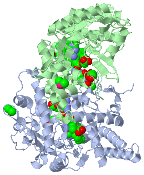 Asymmetric/Biological UnitChain A from PDB Type:PROTEIN Length:416 aligned with NOS3_BOVIN | P29473 from UniProtKB/Swiss-Prot Length:1205 Alignment length:416 76 86 96 106 116 126 136 146 156 166 176 186 196 206 216 226 236 246 256 266 276 286 296 306 316 326 336 346 356 366 376 386 396 406 416 426 436 446 456 466 476 NOS3_BOVIN 67 GPKFPRVKNWELGSITYDTLCAQSQQDGPCTPRCCLGSLVLPRKLQTRPSPGPPPAEQLLSQARDFINQYYSSIKRSGSQAHEERLQEVEAEVASTGTYHLRESELVFGAKQAWRNAPRCVGRIQWGKLQVFDARDCSSAQEMFTYICNHIKYATNRGNLRSAITVFPQRAPGRGDFRIWNSQLVRYAGYRQQDGSVRGDPANVEITELCIQHGWTPGNGRFDVLPLLLQAPDEAPELFVLPPELVLEVPLEHPTLEWFAALGLRWYALPAVSNMLLEIGGLEFSAAPFSGWYMSTEIGTRNLCDPHRYNILEDVAVCMDLDTRTTSSLWKDKAAVEINLAVLHSFQLAKVTIVDHHAATVSFMKHLDNEQKARGGCPADWAWIVPPISGSLTPVFHQEMVNYILSPAFRYQPDPW 482 SCOP domains d1dm8a_ A: Nitric oxide (NO) synthase oxygenase domain SCOP domains CATH domains -----------------1dm8A01 A:84-201,A:228-238,A:342-356,A:426-450 Nitric Oxide Synthase; Chain A, domain 1 1dm8A02 1dm8A01 ---1dm8A02 A:202-227,A:242-313,A:477-481 1dm8A03 -----1dm8A01 --1dm8A03 A:314-336,A:359-424 -1dm8A01 --------------------------1dm8A- CATH domains Pfam domains -------------------------------------------------------------------------------------------------------------------------------------------------------------------------------------------------------------------------------------------------------------------------------------------------------------------------------------------------------------------------------------------------------------------------------- Pfam domains SAPs(SNPs) -------------------------------------------------------------------------------------------------------------------------------------------------------------------------------------------------------------------------------------------------------------------------------------------------------------------------------------------------------------------------------------------------------------------------------- SAPs(SNPs) PROSITE ----------------------------------------------------------------------------------------------------------------------NOS -------------------------------------------------------------------------------------------------------------------------------------------------------------------------------------------------------------------------------------------------------------------------------------------------- PROSITE Transcript -------------------------------------------------------------------------------------------------------------------------------------------------------------------------------------------------------------------------------------------------------------------------------------------------------------------------------------------------------------------------------------------------------------------------------- Transcript 1dm8 A 67 GPKFPRVKNWELGSITYDTLCAQSQQDGPCTPRRCLGSLVLPRKLQTRPSPGPPPAEQLLSQARDFINQYYSSIKRSGSQAHEERLQEVEAEVASTGTYHLRESELVFGAKQAWRNAPRCVGRIQWGKLQVFDARDCSSAQEMFTYICNHIKYATNRGNLRSAITVFPQRAPGRGDFRIWNSQLVRYAGYRQQDGSVRGDPANVEITELCIQHGWTPGNGRFDVLPLLLQAPDEAPELFVLPPELVLEVPLEHPTLEWFAALGLRWYALPAVSNMLLEIGGLEFSAAPFSGWYMSTEIGTRNLCDPHRYNILEDVAVCMDLDTRTTSSLWKDKAAVEINLAVLHSFQLAKVTIVDHHAATVSFMKHLDNEQKARGGCPADWAWIVPPISGSLTPVFHQEMVNYILSPAFRYQPDPW 482 76 86 96 106 116 126 136 146 156 166 176 186 196 206 216 226 236 246 256 266 276 286 296 306 316 326 336 346 356 366 376 386 396 406 416 426 436 446 456 466 476 Chain B from PDB Type:PROTEIN Length:414 aligned with NOS3_BOVIN | P29473 from UniProtKB/Swiss-Prot Length:1205 Alignment length:414 78 88 98 108 118 128 138 148 158 168 178 188 198 208 218 228 238 248 258 268 278 288 298 308 318 328 338 348 358 368 378 388 398 408 418 428 438 448 458 468 478 NOS3_BOVIN 69 KFPRVKNWELGSITYDTLCAQSQQDGPCTPRCCLGSLVLPRKLQTRPSPGPPPAEQLLSQARDFINQYYSSIKRSGSQAHEERLQEVEAEVASTGTYHLRESELVFGAKQAWRNAPRCVGRIQWGKLQVFDARDCSSAQEMFTYICNHIKYATNRGNLRSAITVFPQRAPGRGDFRIWNSQLVRYAGYRQQDGSVRGDPANVEITELCIQHGWTPGNGRFDVLPLLLQAPDEAPELFVLPPELVLEVPLEHPTLEWFAALGLRWYALPAVSNMLLEIGGLEFSAAPFSGWYMSTEIGTRNLCDPHRYNILEDVAVCMDLDTRTTSSLWKDKAAVEINLAVLHSFQLAKVTIVDHHAATVSFMKHLDNEQKARGGCPADWAWIVPPISGSLTPVFHQEMVNYILSPAFRYQPDPW 482 SCOP domains d1dm8b_ B: Nitric oxide (NO) synthase oxygenase domain SCOP domains CATH domains ---------------1dm8B01 B:84-201,B:228-238,B:342-356,B:426-450 Nitric Oxide Synthase; Chain A, domain 1 1dm8B02 1dm8B01 ---1dm8B02 B:202-227,B:242-313,B:477-481 1dm8B03 -----1dm8B01 --1dm8B03 B:314-336,B:359-424 -1dm8B01 --------------------------1dm8B- CATH domains Pfam domains ------------------------------------------------------------------------------------------------------------------------------------------------------------------------------------------------------------------------------------------------------------------------------------------------------------------------------------------------------------------------------------------------------------------------------ Pfam domains SAPs(SNPs) ------------------------------------------------------------------------------------------------------------------------------------------------------------------------------------------------------------------------------------------------------------------------------------------------------------------------------------------------------------------------------------------------------------------------------ SAPs(SNPs) PROSITE --------------------------------------------------------------------------------------------------------------------NOS -------------------------------------------------------------------------------------------------------------------------------------------------------------------------------------------------------------------------------------------------------------------------------------------------- PROSITE Transcript ------------------------------------------------------------------------------------------------------------------------------------------