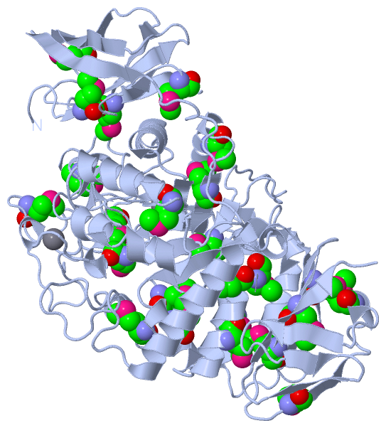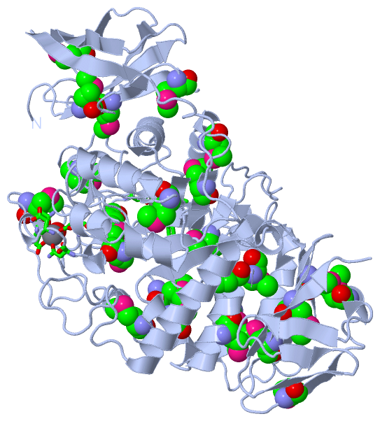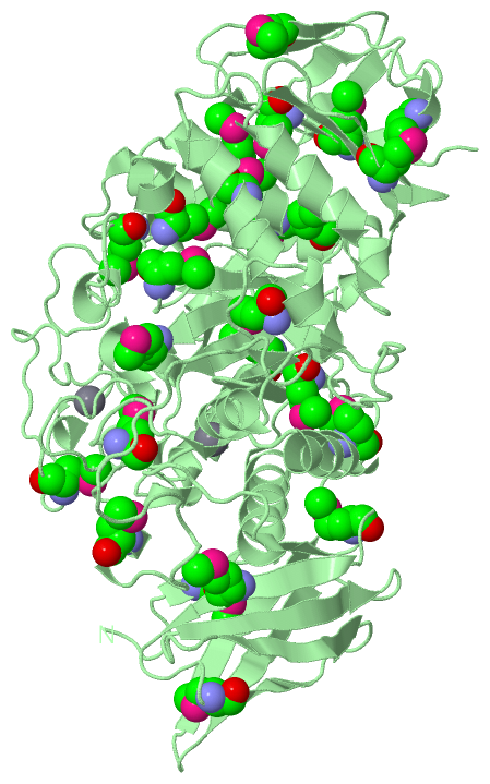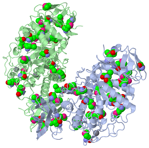 Asymmetric UnitChain A from PDB Type:PROTEIN Length:598 aligned with Q8KKG0_9FLAO | Q8KKG0 from UniProtKB/TrEMBL Length:619 Alignment length:598 30 40 50 60 70 80 90 100 110 120 130 140 150 160 170 180 190 200 210 220 230 240 250 260 270 280 290 300 310 320 330 340 350 360 370 380 390 400 410 420 430 440 450 460 470 480 490 500 510 520 530 540 550 560 570 580 590 600 610 Q8KKG0_9FLAO 21 PTAIEHMEPPFWWAGMQHKGLQLMVHGRDIGRMEAALDYPGVRLVSTTRVPNANYLFVDLEIGPEAQPGSFDIVFKGDGRSERYRYRLLAREQGSAQRQGFGPGDAIYQIMPDRFANGDPSNDNVAGMREQADRRHGGGRHGGDIRGTIDHLDYIAGLGFTQLWPTPLVENDAAAYSYHGYAATDHYRIDPRYGSNEDFVRLSTEARKRGMGLIQDVVLSHIGKHHWWMKDLPTPDWINYGGKFVPTQHHRVAVQDPYAAQADSENFTKGWFVEGMPDLNQTNPLVANYLIQNNIWWIEYAGLSGLRIDTYGYSDGAFLTEYTRRLMAEYPRLNMVGEEWSTRVPVVARWQRGKANFDGYTSHLPSLMDFPLVDAMRNALSKTGEENGLNEVYETLSLDYLYPEPQNLVLFGGNHDMARMFSAAGEDFDRWRMNLVFLMTMPRIPQFYSGDEILMTSTVKGRDDASYRRDFPGGWAGDKANAFSGAGLTSQQRAAQDLVRKLANWRKNQPVIHNGRLMHFGPEENTWVYFRYNKDKRIMVAMNNNDKPMTLPTARFQEMLKGAPSGVDFLSGKTVGLGRELRLAPKSVVVIELPGLPE 618 SCOP domains d1h3ga1 A:3-95 Cyclomaltodextrinase, N-terminal domain d1h3ga3 A:96-517 Cyclomaltodextrinase, central domain d1h3ga2 A:518-600 Cyclomaltodextrinase SCOP domains CATH domains 1h3gA01 A:3-92 Immunoglobulins ------1h3gA02 A:99-517 Glycosidases 1h3gA03 A:518-597 Golgi alpha-mannosidase II --- CATH domains Pfam domains ---------------------------------------------------------------------------------------------------------------------------------------------------------------------------------------------------------------------------------------------------------------------------------------------------------------------------------------------------------------------------------------------------------------------------------------------------------------------------------------------------------------------------------------------------------------------------------------------------------------------- Pfam domains SAPs(SNPs) ---------------------------------------------------------------------------------------------------------------------------------------------------------------------------------------------------------------------------------------------------------------------------------------------------------------------------------------------------------------------------------------------------------------------------------------------------------------------------------------------------------------------------------------------------------------------------------------------------------------------- SAPs(SNPs) PROSITE ---------------------------------------------------------------------------------------------------------------------------------------------------------------------------------------------------------------------------------------------------------------------------------------------------------------------------------------------------------------------------------------------------------------------------------------------------------------------------------------------------------------------------------------------------------------------------------------------------------------------- PROSITE Transcript ---------------------------------------------------------------------------------------------------------------------------------------------------------------------------------------------------------------------------------------------------------------------------------------------------------------------------------------------------------------------------------------------------------------------------------------------------------------------------------------------------------------------------------------------------------------------------------------------------------------------- Transcript 1h3g A 3 PTAIEHmEPPFWWAGmQHKGLQLmVHGRDIGRmEAALDYPGVRLVSTTRVPNANYLFVDLEIGPEAQPGSFDIVFKGDGRSERYRYRLLAREQGSAQRQGFGPGDAIYQImPDRFANGDPSNDNVAGmREQADRRHGGGRHGGDIRGTIDHLDYIAGLGFTQLWPTPLVENDAAAYSYHGYAATDHYRIDPRYGSNEDFVRLSTEARKRGmGLIQDVVLSHIGKHHWWmKDLPTPDWINYGGKFVPTQHHRVAVQDPYAAQADSENFTKGWFVEGmPDLNQTNPLVANYLIQNNIWWIEYAGLSGLRIDTYGYSDGAFLTEYTRRLmAEYPRLNmVGEEWSTRVPVVARWQRGKANFDGYTSHLPSLmDFPLVDAmRNALSKTGEENGLNEVYETLSLDYLYPEPQNLVLFGGNHDmARmFSAAGEDFDRWRmNLVFLmTmPRIPQFYSGDEILmTSTVKGRDDASYRRDFPGGWAGDKANAFSGAGLTSQQRAAQDLVRKLANWRKNQPVIHNGRLmHFGPEENTWVYFRYNKDKRImVAmNNNDKPmTLPTARFQEmLKGAPSGVDFLSGKTVGLGRELRLAPKSVVVIELPGLPE 600 | 12 | 22 | 32 | 42 52 62 72 82 92 102 112| 122 132 142 152 162 172 182 192 202 212| 222 232 242 252 262 272 | 282 292 302 312 322 |332 | 342 352 362 372 | 382 392 402 412 |422 432 | 442| 452 | 462 472 482 492 502 512 522 532 542 | 552 562 572 582 592 9-MSE 18-MSE 26-MSE 35-MSE 113-MSE 130-MSE 213-MSE 231-MSE 278-MSE 329-MSE 337-MSE 370-MSE 378-MSE 419-MSE 435-MSE | | 457-MSE 520-MSE 541-MSE | 561-MSE 422-MSE 441-MSE 544-MSE | 443-MSE 551-MSE Chain B from PDB Type:PROTEIN Length:598 aligned with Q8KKG0_9FLAO | Q8KKG0 from UniProtKB/TrEMBL Length:619 Alignment length:598 30 40 50 60 70 80 90 100 110 120 130 140 150 160 170 180 190 200 210 220 230 240 250 260 270 280 290 300 310 320 330 340 350 360 370 380 390 400 410 420 430 440 450 460 470 480 490 500 510 520 530 540 550 560 570 580 590 600 610 Q8KKG0_9FLAO 21 PTAIEHMEPPFWWAGMQHKGLQLMVHGRDIGRMEAALDYPGVRLVSTTRVPNANYLFVDLEIGPEAQPGSFDIVFKGDGRSERYRYRLLAREQGSAQRQGFGPGDAIYQIMPDRFANGDPSNDNVAGMREQADRRHGGGRHGGDIRGTIDHLDYIAGLGFTQLWPTPLVENDAAAYSYHGYAATDHYRIDPRYGSNEDFVRLSTEARKRGMGLIQDVVLSHIGKHHWWMKDLPTPDWINYGGKFVPTQHHRVAVQDPYAAQADSENFTKGWFVEGMPDLNQTNPLVANYLIQNNIWWIEYAGLSGLRIDTYGYSDGAFLTEYTRRLMAEYPRLNMVGEEWSTRVPVVARWQRGKANFDGYTSHLPSLMDFPLVDAMRNALSKTGEENGLNEVYETLSLDYLYPEPQNLVLFGGNHDMARMFSAAGEDFDRWRMNLVFLMTMPRIPQFYSGDEILMTSTVKGRDDASYRRDFPGGWAGDKANAFSGAGLTSQQRAAQDLVRKLANWRKNQPVIHNGRLMHFGPEENTWVYFRYNKDKRIMVAMNNNDKPMTLPTARFQEMLKGAPSGVDFLSGKTVGLGRELRLAPKSVVVIELPGLPE 618 SCOP domains d1h3gb1 B:3-95 Cyclomaltodextrinase, N-terminal domain d1h3gb3 B:96-517 Cyclomaltodextrinase, central domain d1h3gb2 B:518-600 Cyclomaltodextrinase SCOP domain
