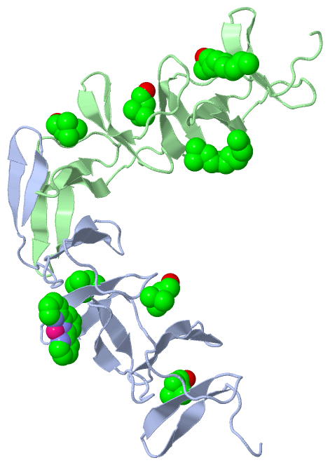 Asymmetric/Biological UnitChain A from PDB Type:PROTEIN Length:127 aligned with ALYS_STRPN | P06653 from UniProtKB/Swiss-Prot Length:318 Alignment length:127 201 211 221 231 241 251 261 271 281 291 301 311 ALYS_STRPN 192 GSYPKDKFEKINGTWYYFDSSGYMLADRWRKHTDGNWYWFDNSGEMATGWKKIADKWYYFNEEGAMKTGWVKYKDTWYYLDAKEGAMVSNAFIQSADGTGWYYLKPDGTLADKPEFTVEPDGLITVK 318 SCOP domains d1hcxa_ A: Choline binding domain of autolysin C-LytA SCOP domains CATH domains 1hcxA00 A:192-318 Cholin Binding CATH domains Pfam domains ------------------------------------------------------------------------------------------------------------------------------- Pfam domains SAPs(SNPs) ------------------------------------------------------------------------------------------------------------------------------- SAPs(SNPs) PROSITE CW -CW PDB: A:196-215 -CW PDB: A:217-237 CW PDB: A:238-257 CW PDB: A:258-277 --CW PDB: A:280-301 ----------------- PROSITE Transcript ------------------------------------------------------------------------------------------------------------------------------- Transcript 1hcx A 192 GSYPKDKFEKINGTWYYFDSSGYMLADRWRKHTDGNWYWFDNSGEMATGWKKIADKWYYFNEEGAMKTGWVKYKDTWYYLDAKEGAMVSNAFIQSADGTGWYYLKPDGTLADRPEFTVEPDGLITVK 318 201 211 221 231 241 251 261 271 281 291 301 311 Chain B from PDB Type:PROTEIN Length:127 aligned with ALYS_STRPN | P06653 from UniProtKB/Swiss-Prot Length:318 Alignment length:127 201 211 221 231 241 251 261 271 281 291 301 311 ALYS_STRPN 192 GSYPKDKFEKINGTWYYFDSSGYMLADRWRKHTDGNWYWFDNSGEMATGWKKIADKWYYFNEEGAMKTGWVKYKDTWYYLDAKEGAMVSNAFIQSADGTGWYYLKPDGTLADKPEFTVEPDGLITVK 318 SCOP domains d1hcxb_ B: Choline binding domain of autolysin C-LytA SCOP domains CATH domains 1hcxB00 B:192-318 Cholin Binding CATH domains Pfam domains ------------------------------------------------------------------------------------------------------------------------------- Pfam domains SAPs(SNPs) ------------------------------------------------------------------------------------------------------------------------------- SAPs(SNPs) PROSITE CW -CW PDB: B:196-215 -CW PDB: B:217-237 CW PDB: B:238-257 CW PDB: B:258-277 --CW PDB: B:280-301 ----------------- PROSITE Transcript ------------------------------------------------------------------------------------------------------------------------------- Transcript 1hcx B 192 GSYPKDKFEKINGTWYYFDSSGYMLADRWRKHTDGNWYWFDNSGEMATGWKKIADKWYYFNEEGAMKTGWVKYKDTWYYLDAKEGAMVSNAFIQSADGTGWYYLKPDGTLADRPEFTVEPDGLITVK 318 201 211 221 231 241 251 261 271 281 291 301 311