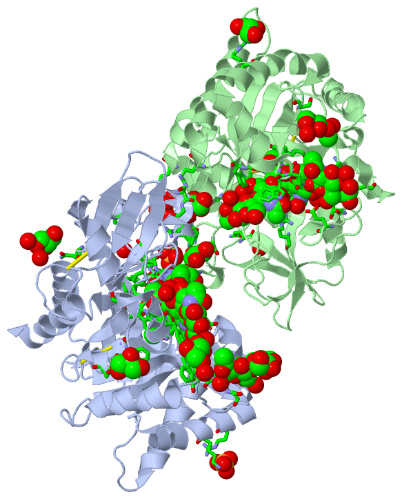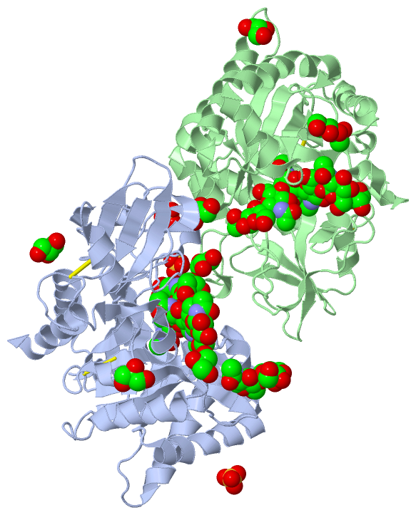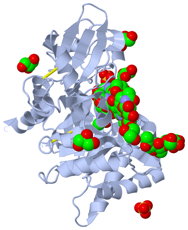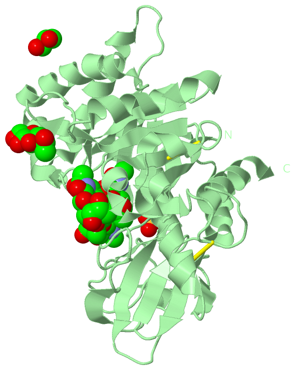 Asymmetric UnitChain A from PDB Type:PROTEIN Length:362 aligned with CH3L1_HUMAN | P36222 from UniProtKB/Swiss-Prot Length:383 Alignment length:362 31 41 51 61 71 81 91 101 111 121 131 141 151 161 171 181 191 201 211 221 231 241 251 261 271 281 291 301 311 321 331 341 351 361 371 381 CH3L1_HUMAN 22 YKLVCYYTSWSQYREGDGSCFPDALDRFLCTHIIYSFANISNDHIDTWEWNDVTLYGMLNTLKNRNPNLKTLLSVGGWNFGSQRFSKIASNTQSRRTFIKSVPPFLRTHGFDGLDLAWLYPGRRDKQHFTTLIKEMKAEFIKEAQPGKKQLLLSAALSAGKVTIDSSYDIAKISQHLDFISIMTYDFHGAWRGTTGHHSPLFRGQEDASPDRFSNTDYAVGYMLRLGAPASKLVMGIPTFGRSFTLASSETGVGAPISGPGIPGRFTKEAGTLAYYEICDFLRGATVHRILGQQVPYATKGNQWVGYDDQESVKSKVQYLKDRQLAGAMVWALDLDDFQGSFCGQDLRFPLTNAIKDALAAT 383 SCOP domains d1hjwa1 A:22-260,A:329-383 Chitinase-3 like protein 1 (GP-39, YKL-40) d1hjwa2 A:261-328 Chitinase-3 like protein 1 (GP-39, YKL-40) d1hjwa1 A:22-260,A:329-383 SCOP domains CATH domains 1hjwA01 A:22-259,A:330-383 Glycosidases 1hjwA02 A:260-329 [code=3.10.50.10, no name defined] 1hjwA01 A:22-259,A:330-383 Glycosidases CATH domains Pfam domains -------------------------------------------------------------------------------------------------------------------------------------------------------------------------------------------------------------------------------------------------------------------------------------------------------------------------------------------------------------------------- Pfam domains SAPs(SNPs) ---------------------------------------------------------------------------------------------------------------------------G---------------------------------------------------------------------------------------------------------------------------------------------------------------------T------------------------------------------------------------------------ SAPs(SNPs) PROSITE -------------------------------------------------------------------------------------------------------------------------------------------------------------------------------------------------------------------------------------------------------------------------------------------------------------------------------------------------------------------------- PROSITE Transcript 1 (1) Exon 1.3 PDB: A:22-86 UniProt: 19-86 [INCOMPLETE] ------------------Exon 1.5 PDB: A:105-155 UniProt: 105-155 Exon 1.6a PDB: A:156-196 -----------------------------------------Exon 1.8a PDB: A:238-298 UniProt: 238-298 Exon 1.8d PDB: A:299-337 Exon 1.8i PDB: A:338-383 UniProt: 338-383 Transcript 1 (1) Transcript 1 (2) ----------------------------------------------------------------Exon 1.4 ------------------------------------------------------------------------------------------Exon 1.7b PDB: A:196-237 UniProt: 196-237-------------------------------------------------------------------------------------------------------------------------------------------------- Transcript 1 (2) 1hjw A 22 YKLVCYYTSWSQYREGDGSCFPDALDRFLCTHIIYSFANISNDHIDTWEWNDVTLYGMLNTLKNRNPNLKTLLSVGGWNFGSQRFSKIASNTQSRRTFIKSVPPFLRTHGFDGLDLAWLYPGRRDKQHFTTLIKEMKAEFIKEAQPGKKQLLLSAALSAGKVTIDSSYDIAKISQHLDFISIMTYDFHGAWRGTTGHHSPLFRGQEDASPDRFSNTDYAVGYMLRLGAPASKLVMGIPTFGRSFTLASSETGVGAPISGPGIPGRFTKEAGTLAYYEICDFLRGATVHRILGQQVPYATKGNQWVGYDDQESVKSKVQYLKDRQLAGAMVWALDLDDFQGSFCGQDLRFPLTNAIKDALAAT 383 31 41 51 61 71 81 91 101 111 121 131 141 151 161 171 181 191 201 211 221 231 241 251 261 271 281 291 301 311 321 331 341 351 361 371 381 Chain B from PDB Type:PROTEIN Length:362 aligned with CH3L1_HUMAN | P36222 from UniProtKB/Swiss-Prot Length:383 Alignment length:362 31 41 51 61 71 81 91 101 111 121 131 141 151 161 171 181 191 201 211 221 231 241 251 261 271 281 291 301 311 321 331 341 351 361 371 381 CH3L1_HUMAN 22 YKLVCYYTSWSQYREGDGSCFPDALDRFLCTHIIYSFANISNDHIDTWEWNDVTLYGMLNTLKNRNPNLKTLLSVGGWNFGSQRFSKIASNTQSRRTFIKSVPPFLRTHGFDGLDLAWLYPGRRDKQHFTTLIKEMKAEFIKEAQPGKKQLLLSAALSAGKVTIDSSYDIAKISQHLDFISIMTYDFHGAWRGTTGHHSPLFRGQEDASPDRFSNTDYAVGYMLRLGAPASKLVMGIPTFGRSFTLASSETGVGAPISGPGIPGRFTKEAGTLAYYEICDFLRGATVHRILGQQVPYATKGNQWVGYDDQESVKSKVQYLKDRQLAGAMVWALDLDDFQGSFCGQDLRFPLTNAIKDALAAT 383 SCOP domains d1hjwb1 B:22-260,B:329-383 Chitinase-3 like protein 1 (GP-39, YKL-40) d1hjwb2 B:261-328 Chitinase-3 like protein 1 (GP-39, YKL-40) d1hjwb1 B:22-260,B:329-383 SCOP domains CATH domains 1hjwB01 B:22-259,B:330-383 Glycosidases 1hjwB02 B:260-329 [code=3.10.50.10, no name defined] 1hjwB01 B:22-259,B:330-383 Glycosidases CATH domains Pfam domains -------------------------------------------------------------------------------------------------------------------------------------------------------------------------------------------------------------------------------------------------------------------------------------------------------------------------------------------------------------------------- Pfam domains SAPs(SNPs) ---------------------------------------------------------------------------------------------------------------------------G---------------------------------------------------------------------------------------------------------------------------------------------------------------------T------------------------------------------------------------------------ SAPs(SNPs) PROSITE -------------------------------------------------------------------------------------------------------------------------------------------------------------------------------------------------------------------------------------------------------------------------------------------------------------------------------------------------------------------------- PROSITE Transcript 1 (1) Exon 1.3 PDB: B:22-86 UniProt: 19-86 [INCOMPLETE] ------------------Exon 1.5 PDB: B:105-155 UniProt: 105-155 Exon 1.6a PDB: B:156-196 -----------------------------------------Exon 1.8a PDB: B:238-298 UniProt: 238-298 Exon 1.8d PDB: B:299-337 Exon 1.8i PDB: B:338-383 UniProt: 338-383 Transcript 1 (1) Transcript 1 (2) ----------------------------------------------------------------Exon 1.4 ----------------------------------------------------------------