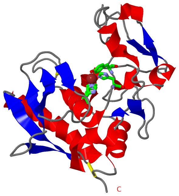 | | GO:0008237 | | metallopeptidase activity | | Catalysis of the hydrolysis of peptide bonds by a mechanism in which water acts as a nucleophile, one or two metal ions hold the water molecule in place, and charged amino acid side chains are ligands for the metal ions. |