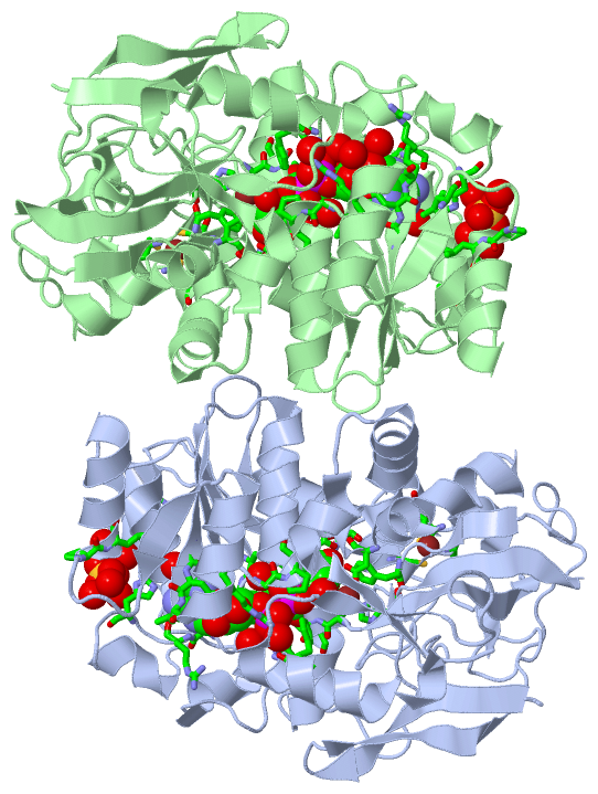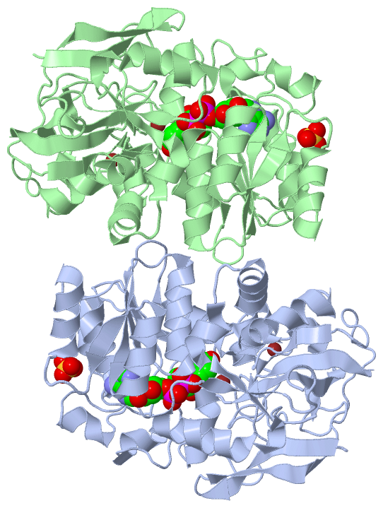 Asymmetric UnitChain A from PDB Type:PROTEIN Length:396 aligned with FADH_PSEPU | P46154 from UniProtKB/Swiss-Prot Length:399 Alignment length:396 12 22 32 42 52 62 72 82 92 102 112 122 132 142 152 162 172 182 192 202 212 222 232 242 252 262 272 282 292 302 312 322 332 342 352 362 372 382 392 FADH_PSEPU 3 GNRGVVYLGSGKVEVQKIDYPKMQDPRGKKIEHGVILKVVSTNICGSDQHMVRGRTTAQVGLVLGHEITGEVIEKGRDVENLQIGDLVSVPFNVACGRCRSCKEMHTGVCLTVNPARAGGAYGYVDMGDWTGGQAEYLLVPYADFNLLKLPDRDKAMEKIRDLTCLSDILPTGYHGAVTAGVGPGSTVYVAGAGPVGLAAAASARLLGAAVVIVGDLNPARLAHAKAQGFEIADLSLDTPLHEQIAALLGEPEVDCAVDAVGFEARGHGHEGAKHEAPATVLNSLMQVTRVAGKIGIPGLYVTEDPGAVDAAAKIGSLSIRFGLGWAKSHSFHTGQTPVMKYNRALMQAIMWDRINIAEVVGVQVISLDDAPRGYGEFDAGVPKKFVIDPHKTFSA 398 SCOP domains d1kola1 A:2-160,A:356-397 Formaldehyde dehydrogenase d1kola2 A:161-355 Formaldehyde dehydrogenase d1kola1 A:2-160,A:356-397 SCOP domains CATH domains 1kolA01 A:2-170,A:338-397 Medium-chain alcohol dehydrogenases, catalytic domain 1kolA02 A:171-337 NAD(P)-binding Rossmann-like Domain 1kolA01 A:2-170,A:338-397 CATH domains Pfam domains ------------------------------------------------------------------------------------------------------------------------------------------------------------------------------------------------------------------------------------------------------------------------------------------------------------------------------------------------------------------------------------------------------------ Pfam domains SAPs(SNPs) ------------------------------------------------------------------------------------------------------------------------------------------------------------------------------------------------------------------------------------------------------------------------------------------------------------------------------------------------------------------------------------------------------------ SAPs(SNPs) PROSITE ----------------------------------------------------------------ADH_ZINC ----------------------------------------------------------------------------------------------------------------------------------------------------------------------------------------------------------------------------------------------------------------------------------------------------------------------------- PROSITE Transcript ------------------------------------------------------------------------------------------------------------------------------------------------------------------------------------------------------------------------------------------------------------------------------------------------------------------------------------------------------------------------------------------------------------ Transcript 1kol A 2 GNRGVVYLGSGKVEVQKIDYPKMQDPRGKKIEHGVILKVVSTNICGSDQHMVRGRTTAQVGLVLGHEITGEVIEKGRDVENLQIGDLVSVPFNVACGRCRSCKEMHTGVCLTVNPARAGGAYGYVDMGDWTGGQAEYVLVPYADFNLLKLPDRDKAMEKIRDLTCLSDILPTGYHGAVTAGVGPGSTVYVAGAGPVGLAAAASARLLGAAVVIVGDLNPARLAHAKAQGFEIADLSLDTPLHEQIAALLGEPEVDCAVDAVGFEARGHGHEGAKHEAPATVLNSLMQVTRVAGKIGIPGLYVTEDPGAVDAAAKIGSLSIRFGLGWAKSHSFHTGQTPVMKYNRALMQAIMWDRINIAEVVGVQVISLDDAPRGYGEFDAGVPKKFVIDPHKTFSA 397 11 21 31 41 51 61 71 81 91 101 111 121 131 141 151 161 171 181 191 201 211 221 231 241 251 261 271 281 291 301 311 321 331 341 351 361 371 381 391 Chain B from PDB Type:PROTEIN Length:396 aligned with FADH_PSEPU | P46154 from UniProtKB/Swiss-Prot Length:399 Alignment length:396 12 22 32 42 52 62 72 82 92 102 112 122 132 142 152 162 172 182 192 202 212 222 232 242 252 262 272 282 292 302 312 322 332 342 352 362 372 382 392 FADH_PSEPU 3 GNRGVVYLGSGKVEVQKIDYPKMQDPRGKKIEHGVILKVVSTNICGSDQHMVRGRTTAQVGLVLGHEITGEVIEKGRDVENLQIGDLVSVPFNVACGRCRSCKEMHTGVCLTVNPARAGGAYGYVDMGDWTGGQAEYLLVPYADFNLLKLPDRDKAMEKIRDLTCLSDILPTGYHGAVTAGVGPGSTVYVAGAGPVGLAAAASARLLGAAVVIVGDLNPARLAHAKAQGFEIADLSLDTPLHEQIAALLGEPEVDCAVDAVGFEARGHGHEGAKHEAPATVLNSLMQVTRVAGKIGIPGLYVTEDPGAVDAAAKIGSLSIRFGLGWAKSHSFHTGQTPVMKYNRALMQAIMWDRINIAEVVGVQVISLDDAPRGYGEFDAGVPKKFVIDPHKTFSA 398 SCOP domains d1kolb1 B:2-160,B:356-397 Formaldehyde dehydrogenase d1kolb2 B:161-355 Formaldehyde dehydrogenase d1kolb1 B:2-160,B:356-397 SCOP domains CATH domains 1kolB01 B:2-170,B:338-397 Medium-chain alcohol dehydrogenases, catalytic domain 1kolB02 B:171-337 NAD(P)-binding Rossmann-like Domain 1kolB01 B:2-170,B:338-397 CATH domains Pfam domains (1) -------------------------------ADH_N-1kolB01 B:33-151 ---------------------AlaDh_PNT_C-1kolB03 B:173-246 ------------------------------------------------------------------------------------------------------------------------------------------------------- Pfam domains (1) Pfam domains (2) -------------------------------ADH_N-1kolB02 B:33-151 ---------------------AlaDh_PNT_C-1kolB04 B:173-246 ------------------------------------------------------------------------------------------------------------------------------------------------------- Pfam domains (2) SAPs(SNPs) ------------------------------------------------------------------------------------------------------------------------------------------------------------------------------------------------------------------------------------------------------------------------------------------------------------------------------------------------------------------------------------------------------------ SAPs(SNPs) PROSITE ----------------------------------------------------------------ADH_ZINC ----------------------------------------------------------------------------------------------------------------------------------------------------------------------------------------------------------------------------------------------------------------------------------------------------------------------------- PROSITE Transcript -------------------------------------------------------------------------------------------------------------------------------------------------------------------------------------------------------------------------------------------------------------------------------------------