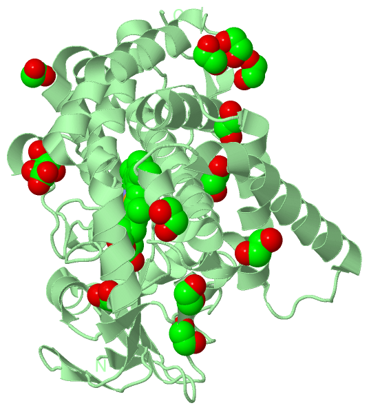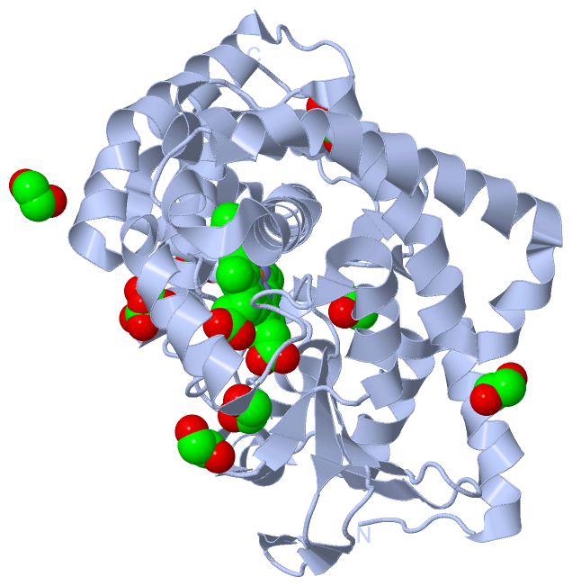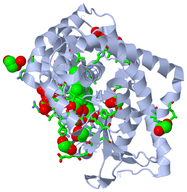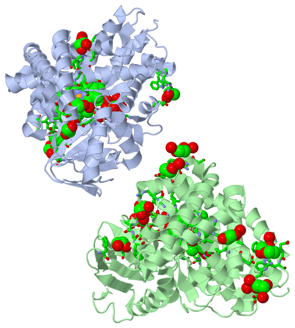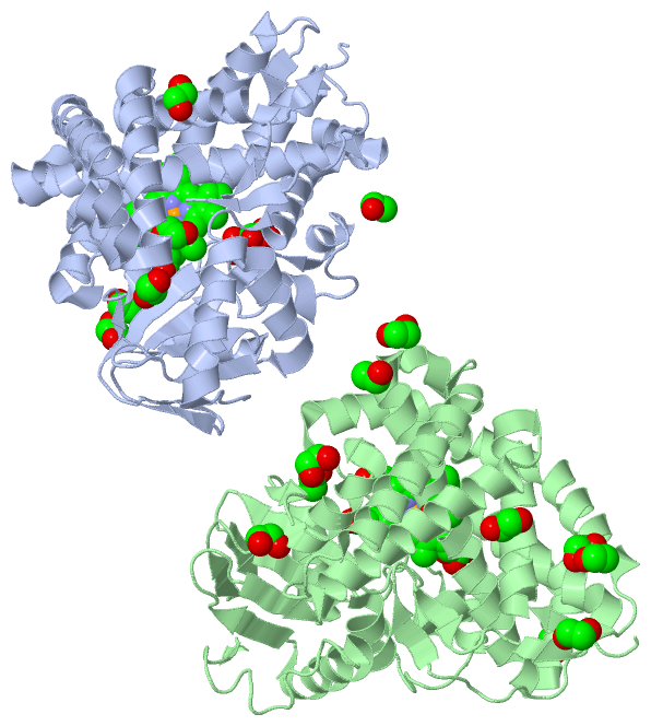 Asymmetric UnitChain A from PDB Type:PROTEIN Length:385 aligned with Q746J6_THET2 | Q746J6 from UniProtKB/TrEMBL Length:389 Alignment length:385 10 20 30 40 50 60 70 80 90 100 110 120 130 140 150 160 170 180 190 200 210 220 230 240 250 260 270 280 290 300 310 320 330 340 350 360 370 380 Q746J6_THET2 1 MKRLSLREAWPYLKDLQQDPLAVLLAWGRAHPRLFLPLPRFPLALIFDPEGVEGALLAEGTTKATFQYRALSRLTGRGLLTDWGESWKEARKALKDPFLPKNVRGYREAMEEEARAFFGEWRGEERDLDHEMLALSLRLLGRALFGKPLSPSLAEHALKALDRIMAQTRSPLALLDLAAEARFRKDRGALYREAEALIVHPPLSHLPRERALSEAVTLLVAGHETVASALTWSFLLLSHRPDWQKRVAESEEAALAAFQEALRLYPPAWILTRRLERPLLLGEDRLPPGTTLVLSPYVTQRLHFPDGEAFRPERFLEERGTPSGRYFPFGLGQRLCLGRDFALLEGPIVLRAFFRRFRLDPLPFPRVLAQVTLRPEGGLPARPRE 385 SCOP domains d1n97a_ A: Cyp175a1 SCOP domains CATH domains 1n97A00 A:1-385 Cytochrome p450 CATH domains Pfam domains ------------------------------------------------------------------------------------------------------------------------------------------------------------------------------------------------------------------------------------------------------------------------------------------------------------------------------------------------------------------------------------------------- Pfam domains SAPs(SNPs) ------------------------------------------------------------------------------------------------------------------------------------------------------------------------------------------------------------------------------------------------------------------------------------------------------------------------------------------------------------------------------------------------- SAPs(SNPs) PROSITE ------------------------------------------------------------------------------------------------------------------------------------------------------------------------------------------------------------------------------------------------------------------------------------------------------------------------------------------------------------------------------------------------- PROSITE Transcript ------------------------------------------------------------------------------------------------------------------------------------------------------------------------------------------------------------------------------------------------------------------------------------------------------------------------------------------------------------------------------------------------- Transcript 1n97 A 1 MKRLSLREAWPYLKDLQQDPLAVLLAWGRAHPRLFLPLPRFPLALIFDPEGVEGALLAEGTTKATFQYRALSRLTGRGLLTDWGESWKEARKALKDPFLPKNVRGYREAMEEEARAFFGEWRGEERDLDHEMLALSLRLLGRALFGKPLSPSLAEHALKALDRIMAQTRSPLALLDLAAEARFRKDRGALYREAEALIVHPPLSHLPRERALSEAVTLLVAGHETVASALTWSFLLLSHRPDWQKRVAESEEAALAAFQEALRLYPPAWILTRRLERPLLLGEDRLPPGTTLVLSPYVTQRLHFPDGEAFRPERFLEERGTPSGRYFPFGLGQRLCLGRDFALLEGPIVLRAFFRRFRLDPLPFPRVLAQVTLRPEGGLPARPRE 385 10 20 30 40 50 60 70 80 90 100 110 120 130 140 150 160 170 180 190 200 210 220 230 240 250 260 270 280 290 300 310 320 330 340 350 360 370 380 Chain B from PDB Type:PROTEIN Length:385 aligned with Q746J6_THET2 | Q746J6 from UniProtKB/TrEMBL Length:389 Alignment length:385 10 20 30 40 50 60 70 80 90 100 110 120 130 140 150 160 170 180 190 200 210 220 230 240 250 260 270 280 290 300 310 320 330 340 350 360 370 380 Q746J6_THET2 1 MKRLSLREAWPYLKDLQQDPLAVLLAWGRAHPRLFLPLPRFPLALIFDPEGVEGALLAEGTTKATFQYRALSRLTGRGLLTDWGESWKEARKALKDPFLPKNVRGYREAMEEEARAFFGEWRGEERDLDHEMLALSLRLLGRALFGKPLSPSLAEHALKALDRIMAQTRSPLALLDLAAEARFRKDRGALYREAEALIVHPPLSHLPRERALSEAVTLLVAGHETVASALTWSFLLLSHRPDWQKRVAESEEAALAAFQEALRLYPPAWILTRRLERPLLLGEDRLPPGTTLVLSPYVTQRLHFPDGEAFRPERFLEERGTPSGRYFPFGLGQRLCLGRDFALLEGPIVLRAFFRRFRLDPLPFPRVLAQVTLRPEGGLPARPRE 385 SCOP domains d1n97b_ B: Cyp175a1 SCOP domains CATH domains 1n97B00 B:1-385 Cytochrome p450 CATH domains Pfam domains (1) --------------------------------------------------------------------------------------------------------------------------------------------------------------------------------------------p450-1n97B01 B:189-379 ------ Pfam domains (1) Pfam domains (2) --------------------------------------------------------------------------------------------------------------------------------------------------------------------------------------------p450-1n97B02 B:189-379 ------ Pfam domains (2) Pfam domains (3) --------------------------------------------------------------------------------------------------------------------------------------------------------------------------------------------p450-1n97B03 B:189-379 ------ Pfam domains (3) Pfam domains (4) --------------------------------------------------------------------------------------------------------------------------------------------------------------------------------------------p450-1n97B04 B:189-379 ------ Pfam domains (4) SAPs(SNPs) ------------------------------------------------------------------------------------------------------------------------------------------------------------------------------------------------------------------------------------------------------------------------------------------------------------------------------------------------------------------------------------------------- SAPs(SNPs) PROSITE ------------------------------------------------------------------------------------------------------------------------------------------------------------------------------------------------------------------------------------------------------------------------------------------------------------------------------------------------------------------------------------------------- PROSITE Transcript ------------------------------------------------------------------------------------------------------------------------------------------------------------------------------------------------------------------------------------------------------------------------------------------------------------------------------------------------------------------------------------------------- Transcript 1n97 B 1 MKRLSLREAWPYLK