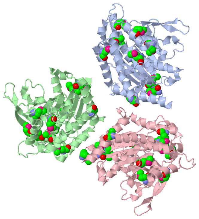 Asymmetric/Biological UnitChain A from PDB Type:PROTEIN Length:360 aligned with PAT17_SOLCD | Q8LPW4 from UniProtKB/Swiss-Prot Length:386 Alignment length:360 34 44 54 64 74 84 94 104 114 124 134 144 154 164 174 184 194 204 214 224 234 244 254 264 274 284 294 304 314 324 334 344 354 364 374 384 PAT17_SOLCD 25 LGEMVTVLSIDGGGIRGIIPATILEFLEGQLQEMDNNADARLADYFDVIGGTSTGGLLTAMISTPNENNRPFAAAKEIVPFYFEHGPQIFNPSGQILGPKYDGKYLMQVLQEKLGETRVHQALTEVVISSFDIKTNKPVIFTKSNLANSPELDAKMYDISYSTAAAPTYFPPHYFVTNTSNGDEYEFNLVDGAVATVADPALLSISVATRLAQKDPAFASIRSLNYKKMLLLSLGTGTTSEFDKTYTAKEAATWTAVHWMLVIQKMTDAASSYMTDYYLSTAFQALDSKNNYLRVQENALTGTTTEMDDASEANMELLVQVGENLLKKPVSEDNPETYEEALKRFAKLLSDRKKLRANKA 384 SCOP domains d1oxwa_ A: Patatin SCOP domains CATH domains 1oxwA00 A:25-384 Cytosolic phospholipase A2 catalytic domain CATH domains Pfam domains ------------------------------------------------------------------------------------------------------------------------------------------------------------------------------------------------------------------------------------------------------------------------------------------------------------------------------------------------------------------------ Pfam domains SAPs(SNPs) ------------------------------------------------------------------------------------------------------------------------------------------------------------------------------------------------------------------------------------------------------------------------------------------------------------------------------------------------------------------------ SAPs(SNPs) PROSITE -------PNPLA PDB: A:32-229 UniProt: 32-229 ----------------------------------------------------------------------------------------------------------------------------------------------------------- PROSITE Transcript ------------------------------------------------------------------------------------------------------------------------------------------------------------------------------------------------------------------------------------------------------------------------------------------------------------------------------------------------------------------------ Transcript 1oxw A 25 LGEmVTVLSIDGGGIRGIIPATILEFLEGQLQEmDNNADARLADYFDVIGGTSTGGLLTAmISTPNENNRPFAAAKEIVPFYFEHGPQIFNPSGQILGPKYDGKYLmQVLQEKLGETRVHQALTEVVISSFDIKTNKPVIFTKSNLANSPELDAKmYDISYSTAAAPTYFPPHYFVTNTSNGDEYEFNLVDGAVATVADPALLSISVATRLAQKDPAFASIRSLNYKKmLLLSLGTGTTSEFDKTYTAKEAATWTAVHWmLVIQKmTDAASSYmTDYYLSTAFQALDSKNNYLRVQENALTGTTTEmDDASEANmELLVQVGENLLKKPVSEDNPETYEEALKRFAKLLSDRKKLRANKA 384 | 34 44 54 | 64 74 84| 94 104 114 124 |134 144 154 164 174 | 184 194 204 214 224 234 244 254 264 274 284 | 294 | 304 314 324 |334 | 344 354 364 374 384 | 58-MSE 85-MSE 131-MSE 180-MSE 253-MSE 284-MSE | 298-MSE 331-MSE 339-MSE 28-MSE 290-MSE Chain B from PDB Type:PROTEIN Length:359 aligned with PAT17_SOLCD | Q8LPW4 from UniProtKB/Swiss-Prot Length:386 Alignment length:359 33 43 53 63 73 83 93 103 113 123 133 143 153 163 173 183 193 203 213 223 233 243 253 263 273 283 293 303 313 323 333 343 353 363 373 PAT17_SOLCD 24 QLGEMVTVLSIDGGGIRGIIPATILEFLEGQLQEMDNNADARLADYFDVIGGTSTGGLLTAMISTPNENNRPFAAAKEIVPFYFEHGPQIFNPSGQILGPKYDGKYLMQVLQEKLGETRVHQALTEVVISSFDIKTNKPVIFTKSNLANSPELDAKMYDISYSTAAAPTYFPPHYFVTNTSNGDEYEFNLVDGAVATVADPALLSISVATRLAQKDPAFASIRSLNYKKMLLLSLGTGTTSEFDKTYTAKEAATWTAVHWMLVIQKMTDAASSYMTDYYLSTAFQALDSKNNYLRVQENALTGTTTEMDDASEANMELLVQVGENLLKKPVSEDNPETYEEALKRFAKLLSDRKKLRAN 382 SCOP domains d1oxwb_ B: Patatin SCOP domains CATH domains 1oxwB00 B:1024-1382 Cytosolic phospholipase A2 catalytic domain CATH domains Pfam domains ----------------------------------------------------------------------------------------------------------------------------------------------------------------------------------------------------------------------------------------------------------------------------------------------------------------------------------------------------------------------- Pfam domains SAPs(SNPs) ----------------------------------------------------------------------------------------------------------------------------------------------------------------------------------------------------------------------------------------------------------------------------------------------------------------------------------------------------------------------- SAPs(SNPs) PROSITE --------PNPLA PDB: B:1032-1229 UniProt: 32-229 --------------------------------------------------------------------------------------------------------------------------------------------------------- PROSITE Transcript ----------------------------------------------------------------------------------------------------------------------------------------------------------------------------------------------------------------------------------------------------------------------------------------------------------------------------------------------------------------------- Transcript 1oxw B 1024 QLGEmVTVLSIDGGGIRGIIPATILEFLEGQLQEmDNNADARLADYFDVIGGTSTGGLLTAmISTPNENNRPFAAAKEIVPFYFEHGPQIFNPSGQILGPKYDGKYLmQVLQEKLGETRVHQALTEVVISSFDIKTNKPVIFTKSNLANSPELDAKmYDISYSTAAAPTYFPPHYFVTNTSNGDEYEFNLVDGAVATVADPALLSISVATRLAQKDPAFASIRSLNYKKmLLLSLGTGTTSEFDKTYTAKEAATWTAVHWmLVIQKmTDAASSYmTDYYLSTAFQALDSKNNYLRVQENALTGTTTEmDDASEANmELLVQVGENLLKKPVSEDNPETYEEALKRFAKLLSDRKKLRAN 1382 | 1033 1043 1053 | 1063 1073 1083 | 1093 1103 1113 1123 1133 1143 1153 1163 1173 1183 1193 1203 1213 1223 1233 1243 1253 1263 1273 1283| 1293 | 1303 1313 1323 1333 |1343 1353 1363 1373 1028-MSE 1058-MSE 1085-MSE 1131-MSE 1180-MSE 1253-MSE 1284-MSE | | 1331-MSE | 1290-MSE | 1339-MSE 1298-MSE Chain C from PDB Type:PROTEIN Length:362 aligned with PAT17_SOLCD | Q8LPW4 from UniProtKB/Swiss-Prot Length:386 Alignment length:362 31 41 51 61 71 81 91 101 111 121 131 141 151 161 171 181 191 201 211 221 231 241 251 261 271 281 291 301 311 321 331 341 351 361 371 381 PAT17_SOLCD 22 FAQLGEMVTVLSIDGGGIRGIIPATILEFLEGQLQEMDNNADARLADYFDVIGGTSTGGLLTAMISTPNENNRPFAAAKEIVPFYFEHGPQIFNPSGQILGPKYDGK