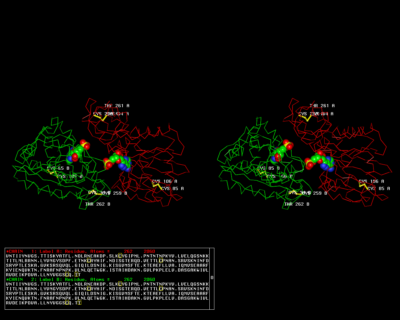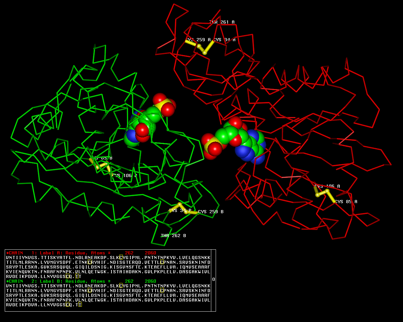 Asymmetric UnitChain A from PDB Type:PROTEIN Length:262 aligned with RIP1_PHYAM | P10297 from UniProtKB/Swiss-Prot Length:313 Alignment length:262 32 42 52 62 72 82 92 102 112 122 132 142 152 162 172 182 192 202 212 222 232 242 252 262 272 282 RIP1_PHYAM 23 VNTIIYNVGSTTISKYATFLNDLRNEAKDPSLKCYGIPMLPNTNTNPKYVLVELQGSNKKTITLMLRRNNLYVMGYSDPFETNKCRYHIFNDISGTERQDVETTLCPNANSRVSKNINFDSRYPTLESKAGVKSRSQVQLGIQILDSNIGKISGVMSFTEKTEAEFLLVAIQMVSEAARFKYIENQVKTNFNRAFNPNPKVLNLQETWGKISTAIHDAKNGVLPKPLELVDASGAKWIVLRVDEIKPDVALLNYVGGSCQTT 284 SCOP domains d1paga_ A: Pokeweed antiviral protein alpha SCOP domains CATH domains 1pagA01 A:1-178 Ricin (A subunit), domain 1 1pagA02 A:179-259 Ricin (A Subunit), domain 2 --- CATH domains Pfam domains ---------------------------------------------------------------------------------------------------------------------------------------------------------------------------------------------------------------------------------------------------------------------- Pfam domains SAPs(SNPs) ---------------------------------------------------------------------------------------------------------------------------------------------------------------------------------------------------------------------------------------------------------------------- SAPs(SNPs) PROSITE --------------------------------------------------------------------------------------------------------------------------------------------------------------------------SHIGA_RICIN --------------------------------------------------------------------------- PROSITE Transcript ---------------------------------------------------------------------------------------------------------------------------------------------------------------------------------------------------------------------------------------------------------------------- Transcript 1pag A 1 VNTIIYNVGSTTISKYATFLNDLRNEAKDPSLKCYGIPMLPNTNTNPKYVLVELQGSNKKTITLMLRRNNLYVMGYSDPFETNKCRYHIFNDISGTERQDVETTLCPNANSRVSKNINFDSRYPTLESKAGVKSRSQVQLGIQILDSNIGKISGVMSFTEKTEAEFLLVAIQMVSEAARFKYIENQVKTNFNRAFNPNPKVLNLQETWGKISTAIHDAKNGVLPKPLELVDASGAKWIVLRVDEIKPDVALLNYVGGSCQTT 262 10 20 30 40 50 60 70 80 90 100 110 120 130 140 150 160 170 180 190 200 210 220 230 240 250 260 Chain B from PDB Type:PROTEIN Length:262 aligned with RIP1_PHYAM | P10297 from UniProtKB/Swiss-Prot Length:313 Alignment length:262 32 42 52 62 72 82 92 102 112 122 132 142 152 162 172 182 192 202 212 222 232 242 252 262 272 282 RIP1_PHYAM 23 VNTIIYNVGSTTISKYATFLNDLRNEAKDPSLKCYGIPMLPNTNTNPKYVLVELQGSNKKTITLMLRRNNLYVMGYSDPFETNKCRYHIFNDISGTERQDVETTLCPNANSRVSKNINFDSRYPTLESKAGVKSRSQVQLGIQILDSNIGKISGVMSFTEKTEAEFLLVAIQMVSEAARFKYIENQVKTNFNRAFNPNPKVLNLQETWGKISTAIHDAKNGVLPKPLELVDASGAKWIVLRVDEIKPDVALLNYVGGSCQTT 284 SCOP domains d1pagb_ B: Pokeweed antiviral protein alpha SCOP domains CATH domains 1pagB01 B:1-178 Ricin (A subunit), domain 1 1pagB02 B:179-259 Ricin (A Subunit), domain 2 --- CATH domains Pfam domains (1) ----RIP-1pagB01 B:5-218 -------------------------------------------- Pfam domains (1) Pfam domains (2) ----RIP-1pagB02 B:5-218 -------------------------------------------- Pfam domains (2) SAPs(SNPs) ---------------------------------------------------------------------------------------------------------------------------------------------------------------------------------------------------------------------------------------------------------------------- SAPs(SNPs) PROSITE --------------------------------------------------------------------------------------------------------------------------------------------------------------------------SHIGA_RICIN --------------------------------------------------------------------------- PROSITE Transcript ---------------------------------------------------------------------------------------------------------------------------------------------------------------------------------------------------------------------------------------------------------------------- Transcript 1pag B 1 VNTIIYNVGSTTISKYATFLNDLRNEAKDPSLKCYGIPMLPNTNTNPKYVLVELQGSNKKTITLMLRRNNLYVMGYSDPFETNKCRYHIFNDISGTERQDVETTLCPNANSRVSKNINFDSRYPTLESKAGVKSRSQVQLGIQILDSNIGKISGVMSFTEKTEAEFLLVAIQMVSEAARFKYIENQVKTNFNRAFNPNPKVLNLQETWGKISTAIHDAKNGVLPKPLELVDASGAKWIVLRVDEIKPDVALLNYVGGSCQTT 262 10 20 30 40 50 60 70 80 90 100 110 120 130 140 150 160 170 180 190 200 210 220 230 240 250 260