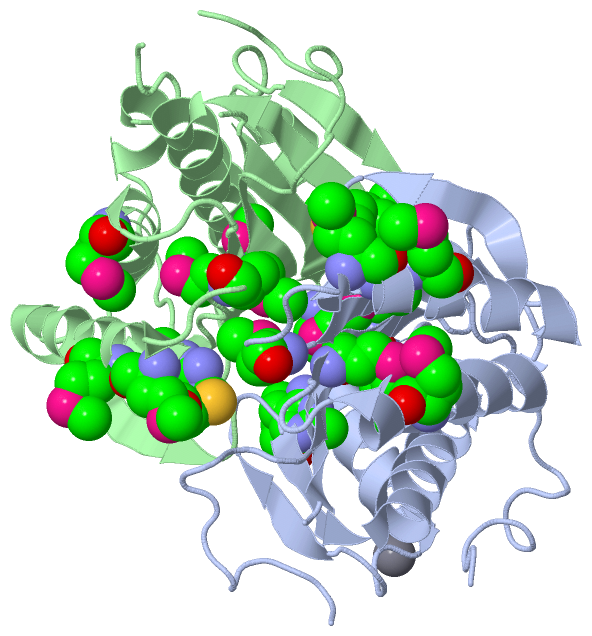 Asymmetric/Biological UnitChain A from PDB Type:PROTEIN Length:182 aligned with YKOF_BACSU | O34911 from UniProtKB/Swiss-Prot Length:200 Alignment length:186 18 28 38 48 58 68 78 88 98 108 118 128 138 148 158 168 178 188 YKOF_BACSU 9 RIAGFRFSLYPMTDDFISVIKSALKKTDTSKVWTKTDHISTVLRGSIDHVFDAAKAIYLHAANSEQHIVMNGTFSIGCPGDTQGDTYLSKGDKRVNEDAVRGLKAEAPCQFALYPMNEPDYMGLIMEAVDIAKAQGTFVQGVHYASELDGDAHDVFSTLEAVFRMAEQQTNHITMTVNLSANSPSR 194 SCOP domains d1sbra_ A: Putative thiamin/HMP-binding protein YkoF SCOP domains CATH domains 1sbrA01 A:9-87 [code=3.30.70.930, no name defined] ------------------------1sbrA02 A:112-194 [code=3.30.70.930, no name defined] CATH domains Pfam domains ------------------------------------------------------------------------------------------------------------------------------------------------------------------------------------------ Pfam domains SAPs(SNPs) ------------------------------------------------------------------------------------------------------------------------------------------------------------------------------------------ SAPs(SNPs) PROSITE ------------------------------------------------------------------------------------------------------------------------------------------------------------------------------------------ PROSITE Transcript ------------------------------------------------------------------------------------------------------------------------------------------------------------------------------------------ Transcript 1sbr A 9 RIAGFRFSLYPmTDDFISVIKSALAATDTSKVWTKTDHISTVLRGSIDHVFDAAKAIYLHAANSEQHIVmNGTFSIGCPGDTQGDTYL----KRVNEDAVRGLKAEAPCQFALYPmNEPDYmGLImEAVDIAKAQGTFVQGVHYASELDGDAHDVFSTLEAVFRmAEQQTNHITmTVNLSANSPSR 194 18 | 28 38 48 58 68 78 88 | - | 108 118 | 128 | | 138 148 158 168 | 178 | 188 20-MSE 78-MSE 96 101 124-MSE | | 173-MSE 183-MSE 130-MSE 134-MSE Chain B from PDB Type:PROTEIN Length:182 aligned with YKOF_BACSU | O34911 from UniProtKB/Swiss-Prot Length:200 Alignment length:184 18 28 38 48 58 68 78 88 98 108 118 128 138 148 158 168 178 188 YKOF_BACSU 9 RIAGFRFSLYPMTDDFISVIKSALKKTDTSKVWTKTDHISTVLRGSIDHVFDAAKAIYLHAANSEQHIVMNGTFSIGCPGDTQGDTYLSKGDKRVNEDAVRGLKAEAPCQFALYPMNEPDYMGLIMEAVDIAKAQGTFVQGVHYASELDGDAHDVFSTLEAVFRMAEQQTNHITMTVNLSANSP 192 SCOP domains d1sbrb_ B: Putative thiamin/HMP-binding protein YkoF SCOP domains CATH domains 1sbrB01 B:9-87 [code=3.30.70.930, no name defined] ------------------------1sbrB02 B:112-192 [code=3.30.70.930, no name defined] CATH domains Pfam domains (1) ---------------------------------------------------------------------------------------------------------Ykof-1sbrB01 B:114-192 Pfam domains (1) Pfam domains (2) ---------------------------------------------------------------------------------------------------------Ykof-1sbrB02 B:114-192 Pfam domains (2) Pfam domains (3) ---------------------------------------------------------------------------------------------------------Ykof-1sbrB03 B:114-192 Pfam domains (3) Pfam domains (4) ---------------------------------------------------------------------------------------------------------Ykof-1sbrB04 B:114-192 Pfam domains (4) SAPs(SNPs) ---------------------------------------------------------------------------------------------------------------------------------------------------------------------------------------- SAPs(SNPs) PROSITE ---------------------------------------------------------------------------------------------------------------------------------------------------------------------------------------- PROSITE Transcript ---------------------------------------------------------------------------------------------------------------------------------------------------------------------------------------- Transcript 1sbr B 9 RIAGFRFSLYPmTDDFISVIKSALAATDTSKVWTKTDHISTVLRGSIDHVFDAAKAIYLHAANSEQHIVmNGTFSIGCPGDTQGDTYLS--DKRVNEDAVRGLKAEAPCQFALYPmNEPDYmGLImEAVDIAKAQGTFVQGVHYASELDGDAHDVFSTLEAVFRmAEQQTNHITmTVNLSANSP 192 18 | 28 38 48 58 68 78 88 |- | 108 118 | 128 | | 138 148 158 168 | 178 | 188 20-MSE 78-MSE 97 | 124-MSE | | 173-MSE 183-MSE 100 130-MSE 134-MSE