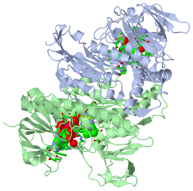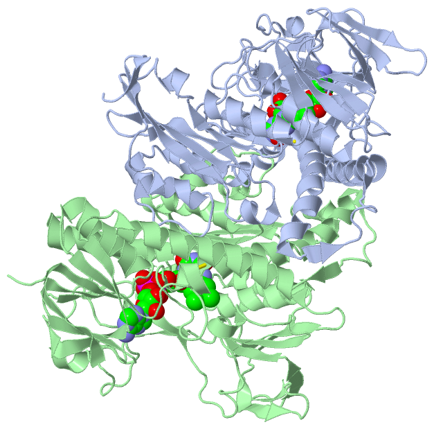 Asymmetric/Biological UnitChain A from PDB Type:PROTEIN Length:487 aligned with TYTR_CRIFA | P39040 from UniProtKB/Swiss-Prot Length:491 Alignment length:487 10 20 30 40 50 60 70 80 90 100 110 120 130 140 150 160 170 180 190 200 210 220 230 240 250 260 270 280 290 300 310 320 330 340 350 360 370 380 390 400 410 420 430 440 450 460 470 480 TYTR_CRIFA 1 MSRAYDLVVIGAGSGGLEAGWNAASLHKKRVAVIDLQKHHGPPHYAALGGTCVNVGCVPKKLMVTGANYMDTIRESAGFGWELDRESVRPNWKALIAAKNKAVSGINDSYEGMFADTEGLTFHQGFGALQDNHTVLVRESADPNSAVLETLDTEYILLATGSWPQHLGIEGDDLCITSNEAFYLDEAPKRALCVGGGYISIEFAGIFNAYKARGGQVDLAYRGDMILRGFDSELRKQLTEQLRANGINVRTHENPAKVTKNADGTRHVVFESGAEADYDVVMLAIGRVPRSQTLQLDKAGVEVAKNGAIKVDAYSKTNVDNIYAIGDVTDRVMLTPVAINEGAAFVDTVFANKPRATDHTKVACAVFSIPPMGVCGYVEEDAAKKYDQVAVYESSFTPLMHNISGSTYKKFMVRIVTNHADGEVLGVHMLGDSSPEIIQSVAICLKMGAKISDFYNTIGVHPTSAEELCSMRTPAYFYQKGKRVEKI 487 SCOP domains d1tyta1 A:1-169,A:287-358 Trypanothione reductase d1tyta2 A:170-286 Trypanothione reductase d1tyta1 A:1-169,A:287-358 Trypanothione reductase d1tyta3 A:359-487 Trypanothione reductase SCOP domains CATH domains 1tytA01 A:1-164,A:286-360 [code=3.50.50.60, no name defined] 1tytA02 A:165-285 [code=3.50.50.60, no name defined] 1tytA01 A:1-164,A:286-360 [code=3.50.50.60, no name defined] 1tytA03 A:361-487 [code=3.30.390.30, no name defined] CATH domains Pfam domains ------------------------------------------------------------------------------------------------------------------------------------------------------------------------------------------------------------------------------------------------------------------------------------------------------------------------------------------------------------------------------------------------------------------------------------------------------------------------------------------------------- Pfam domains SAPs(SNPs) ----------------------------------------------------------------------------------------------------------------------------------------------------------------------------------------------------------------------------------------------------------------------------------------------------------------------------------------------------------------------------------------------------------------------------------------------------------------------------------------------E-------- SAPs(SNPs) PROSITE ------------------------------------------------PYRIDINE_RE-------------------------------------------------------------------------------------------------------------------------------------------------------------------------------------------------------------------------------------------------------------------------------------------------------------------------------------------------------------------------------------------------------------------------------------------- PROSITE Transcript ------------------------------------------------------------------------------------------------------------------------------------------------------------------------------------------------------------------------------------------------------------------------------------------------------------------------------------------------------------------------------------------------------------------------------------------------------------------------------------------------------- Transcript 1tyt A 1 MSRAYDLVVIGAGSGGLEAGWNAASLHKKRVAVIDLQKHHGPPHYAALGGTCVNVGCVPKKLMVTGANYMDTIRESAGFGWELDRESVRPNWKALIAAKNKAVSGINDSYEGMFADTEGLTFHQGFGALQDNHTVLVRESADPNSAVLETLDTEYILLATGSWPQHLGIEGDDLCITSNEAFYLDEAPKRALCVGGGYISIEFAGIFNAYKARGGQVDLAYRGDMILRGFDSELRKQLTEQLRANGINVRTHENPAKVTKNADGTRHVVFESGAEADYDVVMLAIGRVPRSQTLQLDKAGVEVAKNGAIKVDAYSKTNVDNIYAIGDVTDRVMLTPVAINEGAAFVDTVFANKPRATDHTKVACAVFSIPPMGVCGYVEEDAAKKYDQVAVYESSFTPLMHNISGSTYKKFMVRIVTNHADGEVLGVHMLGDSSPEIIQSVAICLKMGAKISDFYNTIGVHPTSAEELCSMRTPAYFYQKGKRVEKI 487 10 20 30 40 50 60 70 80 90 100 110 120 130 140 150 160 170 180 190 200 210 220 230 240 250 260 270 280 290 300 310 320 330 340 350 360 370 380 390 400 410 420 430 440 450 460 470 480 Chain B from PDB Type:PROTEIN Length:486 aligned with TYTR_CRIFA | P39040 from UniProtKB/Swiss-Prot Length:491 Alignment length:486 11 21 31 41 51 61 71 81 91 101 111 121 131 141 151 161 171 181 191 201 211 221 231 241 251 261 271 281 291 301 311 321 331 341 351 361 371 381 391 401 411 421 431 441 451 461 471 481 TYTR_CRIFA 2 SRAYDLVVIGAGSGGLEAGWNAASLHKKRVAVIDLQKHHGPPHYAALGGTCVNVGCVPKKLMVTGANYMDTIRESAGFGWELDRESVRPNWKALIAAKNKAVSGINDSYEGMFADTEGLTFHQGFGALQDNHTVLVRESADPNSAVLETLDTEYILLATGSWPQHLGIEGDDLCITSNEAFYLDEAPKRALCVGGGYISIEFAGIFNAYKARGGQVDLAYRGDMILRGFDSELRKQLTEQLRANGINVRTHENPAKVTKNADGTRHVVFESGAEADYDVVMLAIGRVPRSQTLQLDKAGVEVAKNGAIKVDAYSKTNVDNIYAIGDVTDRVMLTPVAINEGAAFVDTVFANKPRATDHTKVACAVFSIPPMGVCGYVEEDAAKKYDQVAVYESSFTPLMHNISGSTYKKFMVRIVTNHADGEVLGVHMLGDSSPEIIQSVAICLKMGAKISDFYNTIGVHPTSAEELCSMRTPAYFYQKGKRVEKI 487 SCOP domains d1tytb1 B:2-169,B:287-358 Trypanothione reductase d1tytb2 B:170-286 Trypanothione reductase d1tytb1 B:2-169,B:287-358 Trypanothione reductase d1tytb3 B:359-487 Trypanothione reductase SCOP domains CATH domains 1tytB01 B:2-164,B:286-360 [code=3.50.50.60, no name defined] 1tytB02 B:165-285 [code=3.50.50.60, no name defined] 1tytB01 B:2-164,B:286-360 [code=3.50.50.60, no name defined] 1tytB03 B:361-487 [code=3.30.390.30, no name defined] CATH domains Pfam domains (1) --------------------------------------------------------------------------------------------------------------------------------------------------------------------------------------------Pyr_redox-1tytB01 B:190-275 --------------------------------------------------------------------------------------Pyr_redox_dim-1tytB05 B:362-472 --------------- Pfam domains (1) Pfam domains (2) --------------------------------------------------------------------------------------------------------------------------------------------------------------------------------------------Pyr_redox-1tytB02 B:190-275 ------------------------------------------------------------------