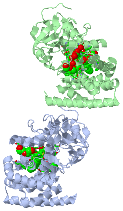 Asymmetric UnitChain A from PDB Type:PROTEIN Length:391 aligned with C5C4_AMYOR | Q8RN03 from UniProtKB/Swiss-Prot Length:406 Alignment length:403 13 23 33 43 53 63 73 83 93 103 113 123 133 143 153 163 173 183 193 203 213 223 233 243 253 263 273 283 293 303 313 323 333 343 353 363 373 383 393 403 C5C4_AMYOR 4 DIDQVAPLLREPANFQLRTNCDPHEDNFGLRAHGPLVRIVGESSTQLGRDFVWQAHGYEVVRRILGDHEHFTTRPQFTQSKSGAHVEAQFVGQISTYDPPEHTRLRKMLTPEFTVRRIRRMEPAIQSLIDDRLDLLEAEGPSADLQGLFADPVGAHALCELLGIPRDDQREFVRRIRRNADLSRGLKARAADSAAFNRYLDNLLARQRADPDDGLLGMIVRDHGDNVTDEELKGLCTALILGGVETVAGMIGFGVLALLDNPGQIELLFESPEKAERVVNELVRYLSPVQAPNPRLAIKDVVIDGQLIKAGDYVLCSILMANRDEALTPDPDVLDANRAAVSDVGFGHGIHYCVGAALARSMLRMAYQTLWRRFPGLRLAVPIEEVKYRSAFVDCPDQVPVTW 406 SCOP domains d1ueda_ A: p450 monoxygenase OxyC SCOP domains CATH domains 1uedA00 A:4-406 Cytochrome p450 CATH domains Pfam domains ------------------------------------------------------------------------------------------------------------------------------------------------------------------------------------------------------------------------------------------------------------------------------------------------------------------------------------------------------------------------------------------------------------------- Pfam domains SAPs(SNPs) ------------------------------------------------------------------------------------------------------------------------------------------------------------------------------------------------------------------------------------------------------------------------------------------------------------------------------------------------------------------------------------------------------------------- SAPs(SNPs) PROSITE ---------------------------------------------------------------------------------------------------------------------------------------------------------------------------------------------------------------------------------------------------------------------------------------------------------------------------------------------------------CYTOCHROME------------------------------------------------ PROSITE Transcript ------------------------------------------------------------------------------------------------------------------------------------------------------------------------------------------------------------------------------------------------------------------------------------------------------------------------------------------------------------------------------------------------------------------- Transcript 1ued A 4 DIDQVAPLLREPANFQLRTNCDPHEDNFGLRAHGPLVRIVGESSTQLGRDFVWQAHGYEVVRRILGDHEHFTTRPQF---------EAQFVGQISTYDPPEHTRLRKMLTPEFTVRRIRRMEPAIQSLIDDRLDLLEAEGPSADLQGLFADPVGAHALCELLGIPRDDQREFVRRIRRNA---RGLKARAADSAAFNRYLDNLLARQRADPDDGLLGMIVRDHGDNVTDEELKGLCTALILGGVETVAGMIGFGVLALLDNPGQIELLFESPEKAERVVNELVRYLSPVQAPNPRLAIKDVVIDGQLIKAGDYVLCSILMANRDEALTPDPDVLDANRAAVSDVGFGHGIHYCVGAALARSMLRMAYQTLWRRFPGLRLAVPIEEVKYRSAFVDCPDQVPVTW 406 13 23 33 43 53 63 73 | - | 93 103 113 123 133 143 153 163 173 183 | 193 203 213 223 233 243 253 263 273 283 293 303 313 323 333 343 353 363 373 383 393 403 80 90 183 187 Chain B from PDB Type:PROTEIN Length:391 aligned with C5C4_AMYOR | Q8RN03 from UniProtKB/Swiss-Prot Length:406 Alignment length:405 11 21 31 41 51 61 71 81 91 101 111 121 131 141 151 161 171 181 191 201 211 221 231 241 251 261 271 281 291 301 311 321 331 341 351 361 371 381 391 401 C5C4_AMYOR 2 GHDIDQVAPLLREPANFQLRTNCDPHEDNFGLRAHGPLVRIVGESSTQLGRDFVWQAHGYEVVRRILGDHEHFTTRPQFTQSKSGAHVEAQFVGQISTYDPPEHTRLRKMLTPEFTVRRIRRMEPAIQSLIDDRLDLLEAEGPSADLQGLFADPVGAHALCELLGIPRDDQREFVRRIRRNADLSRGLKARAADSAAFNRYLDNLLARQRADPDDGLLGMIVRDHGDNVTDEELKGLCTALILGGVETVAGMIGFGVLALLDNPGQIELLFESPEKAERVVNELVRYLSPVQAPNPRLAIKDVVIDGQLIKAGDYVLCSILMANRDEALTPDPDVLDANRAAVSDVGFGHGIHYCVGAALARSMLRMAYQTLWRRFPGLRLAVPIEEVKYRSAFVDCPDQVPVTW 406 SCOP domains d1uedb_ B: p450 monoxygenase OxyC SCOP domains CATH domains 1uedB00 B:2-406 Cytochrome p450 CATH domains Pfam domains (1) ----------------------------------------------------------------------------------------------------------------------------------------------------------------------------------------------------------------------------------------------------------------------------------p450-1uedB01 B:276-381 ------------------------- Pfam domains (1) Pfam domains (2) ----------------------------------------------------------------------------------------------------------------------------------------------------------------------------------------------------------------------------------------------------------------------------------p450-1uedB02 B:276-381 ------------------------- Pfam domains (2) SAPs(SNPs) --------------------------------------------------------------------------------------------------------------------------------------------------------------------------------------------------------------------------------------------------------------------------------------------------------------------------------------------------------------------------------------------------------------------- SAPs(SNPs) PROSITE -----------------------------------------------------------------------------------------------------------------------------------------------------------------------------------------------------------------------------------------------------------------------------------------------------------------------------------------------------------CYTOCHROME------------------------------------------------ PROSITE Transcript --------------------------------------------------------------------------------------------------------------------------------------------------------------------------------------------------------------------------------------------------------------------------------------------------------------------------------------------------------------------------------------------------------------------- Transcript 1ued B 2 GHDIDQVAPLLREPANFQLRTNCDPHEDNFGLRAHGPLVRIVGESSTQL