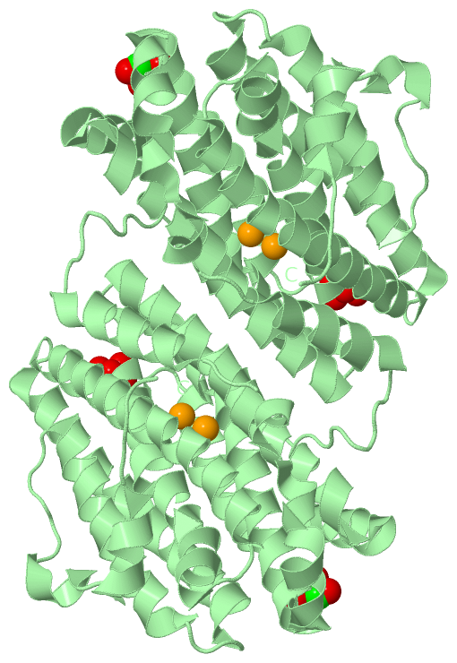 Asymmetric UnitChain A from PDB Type:PROTEIN Length:282 aligned with RIR2B_MYCTO | P9WH70 from UniProtKB/Swiss-Prot Length:324 Alignment length:282 19 29 39 49 59 69 79 89 99 109 119 129 139 149 159 169 179 189 199 209 219 229 239 249 259 269 279 289 RIR2B_MYCTO 10 RVSAINWNRLQDEKDAEVWDRLTGNFWLPEKVPVSNDIPSWGTLTAGEKQLTMRVFTGLTMLDTIQGTVGAVSLIPDALTPHEEAVLTNIAFMESVHAKSYSQIFSTLCSTAEIDDAFRWSEENRNLQRKAEIVLQYYRGDEPLKRKVASTLLESFLFYSGFYLPMYWSSRAKLTNTADMIRLIIRDEAVHGYYIGYKFQRGLALVDDVTRAELKDYTYELLFELYDNEVEYTQDLYDEVGLTEDVKKFLRYNANKALMNLGYEALFPRDETDVNPAILSAL 291 SCOP domains d1uzra_ A: Ribonucleotide reductase R2 SCOP domains CATH domains 1uzrA00 A:10-291 Ribonucleotide Reductase, subunit A CATH domains Pfam domains ------------------------------------------------------------------------------------------------------------------------------------------------------------------------------------------------------------------------------------------------------------------------------------------ Pfam domains SAPs(SNPs) ------------------------------------------------------------------------------------------------------------------------------------------------------------------------------------------------------------------------------------------------------------------------------------------ SAPs(SNPs) PROSITE --------------------------------------------------------------------------------------------RIBORED_SMALL ----------------------------------------------------------------------------------------------------------------------------------------------------------------------------- PROSITE Transcript ------------------------------------------------------------------------------------------------------------------------------------------------------------------------------------------------------------------------------------------------------------------------------------------ Transcript 1uzr A 10 RVSAINWNRLQDEKDAEVWDRLTGNFWLPEKVPVSNDIPSWGTLTAGEKQLTMRVFTGLTMLDTIQGTVGAVSLIPDALTPHEEAVLTNIAFMESVHAKSYSQIFSTLCSTAEIDDAFRWSEENRNLQRKAEIVLQSYRGDEPLKRKVASTLLESFLFYSGFYLPMYWSSRAKLTNTADMIRLIIRDEAVHGYYIGYKFQRGLALVDDVTRAELKDYTYELLFELYDNEVEYTQDLYDEVGLTEDVKKFLRYNANKALMNLGYEALFPRDETDVNPAILSAL 291 19 29 39 49 59 69 79 89 99 109 119 129 139 149 159 169 179 189 199 209 219 229 239 249 259 269 279 289 Chain A from PDB Type:PROTEIN Length:282 aligned with RIR2B_MYCTU | P9WH71 from UniProtKB/Swiss-Prot Length:324 Alignment length:282 19 29 39 49 59 69 79 89 99 109 119 129 139 149 159 169 179 189 199 209 219 229 239 249 259 269 279 289 RIR2B_MYCTU 10 RVSAINWNRLQDEKDAEVWDRLTGNFWLPEKVPVSNDIPSWGTLTAGEKQLTMRVFTGLTMLDTIQGTVGAVSLIPDALTPHEEAVLTNIAFMESVHAKSYSQIFSTLCSTAEIDDAFRWSEENRNLQRKAEIVLQYYRGDEPLKRKVASTLLESFLFYSGFYLPMYWSSRAKLTNTADMIRLIIRDEAVHGYYIGYKFQRGLALVDDVTRAELKDYTYELLFELYDNEVEYTQDLYDEVGLTEDVKKFLRYNANKALMNLGYEALFPRDETDVNPAILSAL 291 SCOP domains d1uzra_ A: Ribonucleotide reductase R2 SCOP domains CATH domains 1uzrA00 A:10-291 Ribonucleotide Reductase, subunit A CATH domains Pfam domains ------------------------------------------------------------------------------------------------------------------------------------------------------------------------------------------------------------------------------------------------------------------------------------------ Pfam domains SAPs(SNPs) ------------------------------------------------------------------------------------------------------------------------------------------------------------------------------------------------------------------------------------------------------------------------------------------ SAPs(SNPs) PROSITE (2) --------------------------------------------------------------------------------------------RIBORED_SMALL ----------------------------------------------------------------------------------------------------------------------------------------------------------------------------- PROSITE (2) Transcript ------------------------------------------------------------------------------------------------------------------------------------------------------------------------------------------------------------------------------------------------------------------------------------------ Transcript 1uzr A 10 RVSAINWNRLQDEKDAEVWDRLTGNFWLPEKVPVSNDIPSWGTLTAGEKQLTMRVFTGLTMLDTIQGTVGAVSLIPDALTPHEEAVLTNIAFMESVHAKSYSQIFSTLCSTAEIDDAFRWSEENRNLQRKAEIVLQSYRGDEPLKRKVASTLLESFLFYSGFYLPMYWSSRAKLTNTADMIRLIIRDEAVHGYYIGYKFQRGLALVDDVTRAELKDYTYELLFELYDNEVEYTQDLYDEVGLTEDVKKFLRYNANKALMNLGYEALFPRDETDVNPAILSAL 291 19 29 39 49 59 69 79 89 99 109 119 129 139 149 159 169 179 189 199 209 219 229 239 249 259 269 279 289 Chain B from PDB Type:PROTEIN Length:288 aligned with RIR2B_MYCTO | P9WH70 from UniProtKB/Swiss-Prot Length:324 Alignment length:288 18 28 38 48 58 68 78 88 98 108 118 128 138 148 158 168 178 188 198 208 218 228 238 248 258 268 278 288 RIR2B_MYCTO 9 DRVSAINWNRLQDEKDAEVWDRLTGNFWLPEKVPVSNDIPSWGTLTAGEKQLTMRVFTGLTMLDTIQGTVGAVSLIPDALTPHEEAVLTNIAFMESVHAKSYSQIFSTLCSTAEIDDAFRWSEENRNLQRKAEIVLQYYRGDEPLKRKVASTLLESFLFYSGFYLPMYWSSRAKLTNTADMIRLIIRDEAVHGYYIGYKFQRGLALVDDVTRAELKDYTYELLFELYDNEVEYTQDLYDEVGLTEDVKKFLRYNANKALMNLGYEALFPRDETDVNPAILSALSPNAD 296 SCOP domains d1uzrb_ B: Ribonucleotide reductase R2 SCOP domains CATH domains 1uzrB00 B:9-296 Ribonucleotide Reductase, subunit A CATH domains Pfam domains ------------------------------------------------------------------------------------------------------------------------------------------------------------------------------------------------------------------------------------------------------------------------------------------------ Pfam domains SAPs(SNPs) ------------------------------------------------------------------------------------------------------------------------------------------------------------------------------------------------------------------------------------------------------------------------------------------------ SAPs(SNPs) PROSITE ---------------------------------------------------------------
