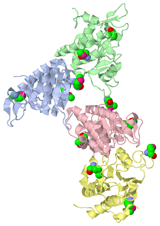 Asymmetric UnitChain A from PDB Type:PROTEIN Length:198 aligned with RS2_ARCFU | O29132 from UniProtKB/Swiss-Prot Length:197 Alignment length:198 197 14 24 34 44 54 64 74 84 94 104 114 124 134 144 154 164 174 184 194 | RS2_ARCFU 5 EYEYLVPPDDYLAAGVHIGTQIKTGDMKKFIFKVRQDGLYVLDIRKLDERIRVAAKFLSRYEPSKILLVAARQYAHKPVQMFSKVVGSDYIVGRFIPGTLTNPMLSEYREPEVVFVNDPAIDKQAVSEATAVGIPVVALCDSNNSSADVDLVIPTNNKGRRALAIVYWLLAREIAKIRGQDFTYSIEDFEAEL----- - SCOP domains d1vi5a_ A: Ribosomal protein S2 SCOP domains CATH domains ------------------------------------------------------------------------------------------------------------------------------------------------------------------------------------------------------ CATH domains Pfam domains ------------------------------------------------------------------------------------------------------------------------------------------------------------------------------------------------------ Pfam domains SAPs(SNPs) ------------------------------------------------------------------------------------------------------------------------------------------------------------------------------------------------------ SAPs(SNPs) PROSITE --------------------------------------------------------------------------------------------------------------RIBOSOMAL_S2_2 --------------------------------------------------------------- PROSITE Transcript ------------------------------------------------------------------------------------------------------------------------------------------------------------------------------------------------------ Transcript 1vi5 A 5 EYEYLVPPDDYLAAGVHIGTQIKTGDmKKFIFKVRQDGLYVLDIRKLDERIRVAAKFLSRYEPSKILLVAARQYAHKPVQmFSKVVGSDYIVGRFIPGTLTNPmLSEYREPEVVFVNDPAIDKQAVSEATAVGIPVVALCDSNNSSADVDLVIPTNNKGRRALAIVYWLLAREIAKIRGQDFTYSIEDFEAELEGGSH 202 14 24 | 34 44 54 64 74 84| 94 104 | 114 124 134 144 154 164 174 184 194 31-MSE 85-MSE 108-MSE Chain B from PDB Type:PROTEIN Length:195 aligned with RS2_ARCFU | O29132 from UniProtKB/Swiss-Prot Length:197 Alignment length:195 197 13 23 33 43 53 63 73 83 93 103 113 123 133 143 153 163 173 183 193 | RS2_ARCFU 4 KEYEYLVPPDDYLAAGVHIGTQIKTGDMKKFIFKVRQDGLYVLDIRKLDERIRVAAKFLSRYEPSKILLVAARQYAHKPVQMFSKVVGSDYIVGRFIPGTLTNPMLSEYREPEVVFVNDPAIDKQAVSEATAVGIPVVALCDSNNSSADVDLVIPTNNKGRRALAIVYWLLAREIAKIRGQDFTYSIEDFEAEL- - SCOP domains d1vi5b_ B: Ribosomal protein S2 SCOP domains CATH domains --------------------------------------------------------------------------------------------------------------------------------------------------------------------------------------------------- CATH domains Pfam domains --------------------------------------------------------------------------------------------------------------------------------------------------------------------------------------------------- Pfam domains SAPs(SNPs) --------------------------------------------------------------------------------------------------------------------------------------------------------------------------------------------------- SAPs(SNPs) PROSITE ---------------------------------------------------------------------------------------------------------------RIBOSOMAL_S2_2 ----------------------------------------------------------- PROSITE Transcript --------------------------------------------------------------------------------------------------------------------------------------------------------------------------------------------------- Transcript 1vi5 B 4 KEYEYLVPPDDYLAAGVHIGTQIKTGDmKKFIFKVRQDGLYVLDIRKLDERIRVAAKFLSRYEPSKILLVAARQYAHKPVQmFSKVVGSDYIVGRFIPGTLTNPmLSEYREPEVVFVNDPAIDKQAVSEATAVGIPVVALCDSNNSSADVDLVIPTNNKGRRALAIVYWLLAREIAKIRGQDFTYSIEDFEAELE 198 13 23 |33 43 53 63 73 83 | 93 103 | 113 123 133 143 153 163 173 183 193 31-MSE 85-MSE 108-MSE Chain C from PDB Type:PROTEIN Length:193 aligned with RS2_ARCFU | O29132 from UniProtKB/Swiss-Prot Length:197 Alignment length:193 197 15 25 35 45 55 65 75 85 95 105 115 125 135 145 155 165 175 185 195 | RS2_ARCFU 6 YEYLVPPDDYLAAGVHIGTQIKTGDMKKFIFKVRQDGLYVLDIRKLDERIRVAAKFLSRYEPSKILLVAARQYAHKPVQMFSKVVGSDYIVGRFIPGTLTNPMLSEYREPEVVFVNDPAIDKQAVSEATAVGIPVVALCDSNNSSADVDLVIPTNNKGRRALAIVYWLLAREIAKIRGQDFTYSIEDFEAEL- - SCOP domains d1vi5c_ C: Ribosomal protein S2 SCOP domains CATH domains ------------------------------------------------------------------------------------------------------------------------------------------------------------------------------------------------- CATH domains Pfam domains ------------------------------------------------------------------------------------------------------------------------------------------------------------------------------------------------- Pfam domains SAPs(SNPs) ------------------------------------------------------------------------------------------------------------------------------------------------------------------------------------------------- SAPs(SNPs) PROSITE -------------------------------------------------------------------------------------------------------------RIBOSOMAL_S2_2 ----------------------------------------------------------- PROSITE Transcript ------------------------------------------------------------------------------------------------------------------------------------------------------------------------------------------------- Transcript 1vi5 C 6 YEYLVPPDDYLAAGVHIGTQIKTGDmKKFIFKVRQDGLYVLDIRKLDERIRVAAKFLSRYEPSKILLVAARQYAHKPVQmFSKVVGSDYIVGRFIPGTLTNPmLSEYREPEVVFVNDPAIDKQAVSEATAVGIPVVALCDSNNSSADVDLVIPTNNKGRRALAIVYWLLAREIAKIRGQDFTYSIEDFEAELE 198 15 25 | 35 45 55 65 75 85 95 105 | 115 125 135 145 155 165 175 185 195 31-MSE 85-MSE 108-MSE Chain D from PDB Type:PROTEIN Length:192 aligned with RS2_ARCFU | O29132 from UniProtKB/Swiss-Prot Length:197 Alignment length:192 15 25 35 45 55 65 75 85 95 105 115 125 135 145 155 165 175 185 195 RS2_ARCFU 6 YEYLVPPDDYLAAGVHIGTQIKTGDMKKFIFKVRQDGLYVLDIRKLDERIRVAAKFLSRYEPSKILLVAARQYAHKPVQMFSKVVGSDYIVGRFIPGTLTNPMLSEYREPEVVFVNDPAIDKQAVSEATAVGIPVVALCDSNNSSADVDLVIPTNNKGRRALAIVYWLLAREIAKIRGQDFTYSIEDFEAEL 197 S