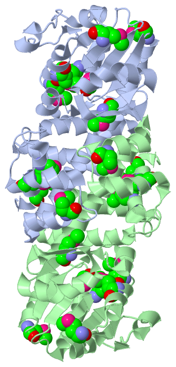 Asymmetric UnitChain A from PDB Type:PROTEIN Length:291 aligned with Q8ZR83_SALTY | Q8ZR83 from UniProtKB/TrEMBL Length:292 Alignment length:291 10 20 30 40 50 60 70 80 90 100 110 120 130 140 150 160 170 180 190 200 210 220 230 240 250 260 270 280 290 Q8ZR83_SALTY 1 MKLGFIGLGIMGSPMAINLARAGHQLHVTTIGPVADELLSLGAVNVETARQVTEFADIIFIMVPDTPQVEDVLFGEHGCAKTSLQGKTIVDMSSISPIETKRFAQRVNEMGADYLDAPVSGGEIGAREGTLSIMVGGEQKVFDRVKPLFDILGKNITLVGGNGDGQTCKVANQIIVALNIEAVSEALVFASKAGADPVRVRQALMGGFASSRILEVHGERMINRTFEPGFKIALHQKDLNLALQSAKALALNLPNTATCQELFNTCAANGGSQLDHSAMVQALELMANHKL 291 SCOP domains d1yb4a1 A:1-160 automated matches d1yb4a2 A:161-291 automated matches SCOP domains CATH domains -1yb4A01 A:2-158 NAD(P)-binding Rossmann-like Domain 1yb4A02 A:159-291 N-(1-d-carboxylethyl)-l-norvaline Dehydrogenase; domain 2 CATH domains Pfam domains --------------------------------------------------------------------------------------------------------------------------------------------------------------------------------------------------------------------------------------------------------------------------------------------------- Pfam domains SAPs(SNPs) --------------------------------------------------------------------------------------------------------------------------------------------------------------------------------------------------------------------------------------------------------------------------------------------------- SAPs(SNPs) PROSITE --------------------------------------------------------------------------------------------------------------------------------------------------------------------------------------------------------------------------------------------------------------------------------------------------- PROSITE Transcript --------------------------------------------------------------------------------------------------------------------------------------------------------------------------------------------------------------------------------------------------------------------------------------------------- Transcript 1yb4 A 1 mKLGFIGLGImGSPmAINLARAGHQLHVTTIGPVADELLSLGAVNVETARQVTEFADIIFImVPDTPQVEDVLFGEHGCAKTSLQGKTIVDmSSISPIETKRFAQRVNEmGADYLDAPVSGGEIGAREGTLSImVGGEQKVFDRVKPLFDILGKNITLVGGNGDGQTCKVANQIIVALNIEAVSEALVFASKAGADPVRVRQALmGGFASSRILEVHGERmINRTFEPGFKIALHQKDLNLALQSAKALALNLPNTATCQELFNTCAANGGSQLDHSAmVQALELmANHKL 291 | 10| | 20 30 40 50 60 | 70 80 90 | 100 110 120 130 | 140 150 160 170 180 190 200 | 210 220| 230 240 250 260 270 280 | 290 | 11-MSE 62-MSE 92-MSE 110-MSE 134-MSE 205-MSE 221-MSE 279-MSE | 1-MSE 15-MSE 286-MSE Chain B from PDB Type:PROTEIN Length:291 aligned with Q8ZR83_SALTY | Q8ZR83 from UniProtKB/TrEMBL Length:292 Alignment length:291 10 20 30 40 50 60 70 80 90 100 110 120 130 140 150 160 170 180 190 200 210 220 230 240 250 260 270 280 290 Q8ZR83_SALTY 1 MKLGFIGLGIMGSPMAINLARAGHQLHVTTIGPVADELLSLGAVNVETARQVTEFADIIFIMVPDTPQVEDVLFGEHGCAKTSLQGKTIVDMSSISPIETKRFAQRVNEMGADYLDAPVSGGEIGAREGTLSIMVGGEQKVFDRVKPLFDILGKNITLVGGNGDGQTCKVANQIIVALNIEAVSEALVFASKAGADPVRVRQALMGGFASSRILEVHGERMINRTFEPGFKIALHQKDLNLALQSAKALALNLPNTATCQELFNTCAANGGSQLDHSAMVQALELMANHKL 291 SCOP domains d1yb4b1 B:1-160 automated matches d1yb4b2 B:161-291 automated matches SCOP domains CATH domains -1yb4B01 B:2-158 NAD(P)-binding Rossmann-like Domain 1yb4B02 B:159-291 N-(1-d-carboxylethyl)-l-norvaline Dehydrogenase; domain 2 CATH domains Pfam domains (1) NAD_binding_2-1yb4B01 B:1-162 --------------------------------------------------------------------------------------------------------------------------------- Pfam domains (1) Pfam domains (2) NAD_binding_2-1yb4B02 B:1-162 --------------------------------------------------------------------------------------------------------------------------------- Pfam domains (2) SAPs(SNPs) --------------------------------------------------------------------------------------------------------------------------------------------------------------------------------------------------------------------------------------------------------------------------------------------------- SAPs(SNPs) PROSITE --------------------------------------------------------------------------------------------------------------------------------------------------------------------------------------------------------------------------------------------------------------------------------------------------- PROSITE Transcript --------------------------------------------------------------------------------------------------------------------------------------------------------------------------------------------------------------------------------------------------------------------------------------------------- Transcript 1yb4 B 1 mKLGFIGLGImGSPmAINLARAGHQLHVTTIGPVADELLSLGAVNVETARQVTEFADIIFImVPDTPQVEDVLFGEHGCAKTSLQGKTIVDmSSISPIETKRFAQRVNEmGADYLDAPVSGGEIGAREGTLSImVGGEQKVFDRVKPLFDILGKNITLVGGNGDGQTCKVANQIIVALNIEAVSEALVFASKAGADPVRVRQALmGGFASSRILEVHGERmINRTFEPGFKIALHQKDLNLALQSAKALALNLPNTATCQELFNTCAANGGSQLDHSAmVQALELmANHKL 291 | 10| | 20 30 40 50 60 | 70 80 90 | 100 110 120 130 | 140 150 160 170 180 190 200 | 210 220| 230 240 250 260 270 280 | 290 1-MSE 11-MSE 62-MSE 92-MSE 110-MSE 134-MSE 205-MSE 221-MSE 279-MSE | 15-MSE 286-MSE