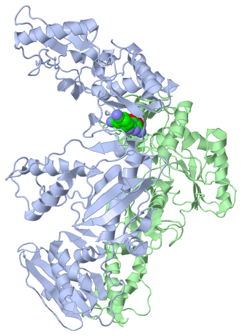 protein, nucleic acid: cartoon; ligands: spacefill; active site: ball and stick