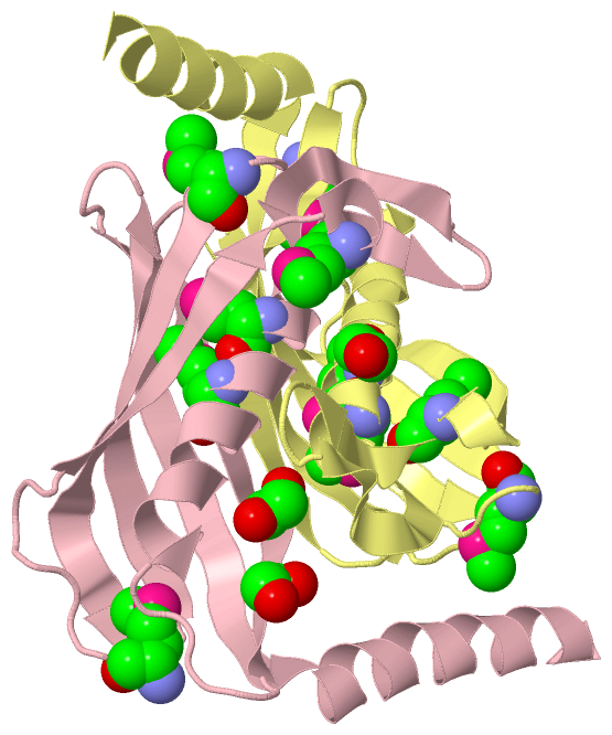 Asymmetric UnitChain A from PDB Type:PROTEIN Length:138 aligned with Q5SJP1_THET8 | Q5SJP1 from UniProtKB/TrEMBL Length:141 Alignment length:138 10 20 30 40 50 60 70 80 90 100 110 120 130 Q5SJP1_THET8 1 MRPIPEGYEAVFETVVTPEMTVRFEELGPVHPVYATYWMVKHMELAGRKIILPFLEEGEEGIGSYVEARHLASALPGMRVRVVARHEKTEGNRVYARVEAYNELGDLIGVGRTEQVILPKAKVEALFRRLKERWEAER 138 SCOP domains d2cwza1 A:1-138 Hypothetical protein TTHA0967 SCOP domains CATH domains ------------------------------------------------------------------------------------------------------------------------------------------ CATH domains Pfam domains ------------------------------------------------------------------------------------------------------------------------------------------ Pfam domains SAPs(SNPs) ------------------------------------------------------------------------------------------------------------------------------------------ SAPs(SNPs) PROSITE ------------------------------------------------------------------------------------------------------------------------------------------ PROSITE Transcript ------------------------------------------------------------------------------------------------------------------------------------------ Transcript 2cwz A 1 mRPIPEGYEAVFETVVTPEmTVRFEELGPVHPVYATYWmVKHmELAGRKIILPFLEEGEEGIGSYVEARHLASALPGmRVRVVARHEKTEGNRVYARVEAYNELGDLIGVGRTEQVILPKAKVEALFRRLKERWEAER 138 | 10 20 30 40 | 50 60 70 |80 90 100 110 120 130 | 20-MSE 39-MSE 78-MSE 1-MSE 43-MSE Chain B from PDB Type:PROTEIN Length:137 aligned with Q5SJP1_THET8 | Q5SJP1 from UniProtKB/TrEMBL Length:141 Alignment length:137 10 20 30 40 50 60 70 80 90 100 110 120 130 Q5SJP1_THET8 1 MRPIPEGYEAVFETVVTPEMTVRFEELGPVHPVYATYWMVKHMELAGRKIILPFLEEGEEGIGSYVEARHLASALPGMRVRVVARHEKTEGNRVYARVEAYNELGDLIGVGRTEQVILPKAKVEALFRRLKERWEAE 137 SCOP domains d2cwzb_ B: Hypothetical protein TTHA0967 SCOP domains CATH domains ----------------------------------------------------------------------------------------------------------------------------------------- CATH domains Pfam domains ----------------------------------------------------------------------------------------------------------------------------------------- Pfam domains SAPs(SNPs) ----------------------------------------------------------------------------------------------------------------------------------------- SAPs(SNPs) PROSITE ----------------------------------------------------------------------------------------------------------------------------------------- PROSITE Transcript ----------------------------------------------------------------------------------------------------------------------------------------- Transcript 2cwz B 1 mRPIPEGYEAVFETVVTPEmTVRFEELGPVHPVYATYWmVKHmELAGRKIILPFLEEGEEGIGSYVEARHLASALPGmRVRVVARHEKTEGNRVYARVEAYNELGDLIGVGRTEQVILPKAKVEALFRRLKERWEAE 137 | 10 20 30 40 | 50 60 70 |80 90 100 110 120 130 1-MSE 20-MSE 39-MSE 78-MSE 43-MSE Chain C from PDB Type:PROTEIN Length:137 aligned with Q5SJP1_THET8 | Q5SJP1 from UniProtKB/TrEMBL Length:141 Alignment length:137 10 20 30 40 50 60 70 80 90 100 110 120 130 Q5SJP1_THET8 1 MRPIPEGYEAVFETVVTPEMTVRFEELGPVHPVYATYWMVKHMELAGRKIILPFLEEGEEGIGSYVEARHLASALPGMRVRVVARHEKTEGNRVYARVEAYNELGDLIGVGRTEQVILPKAKVEALFRRLKERWEAE 137 SCOP domains d2cwzc_ C: Hypothetical protein TTHA0967 SCOP domains CATH domains ----------------------------------------------------------------------------------------------------------------------------------------- CATH domains Pfam domains ----------------------------------------------------------------------------------------------------------------------------------------- Pfam domains SAPs(SNPs) ----------------------------------------------------------------------------------------------------------------------------------------- SAPs(SNPs) PROSITE ----------------------------------------------------------------------------------------------------------------------------------------- PROSITE Transcript ----------------------------------------------------------------------------------------------------------------------------------------- Transcript 2cwz C 1 mRPIPEGYEAVFETVVTPEmTVRFEELGPVHPVYATYWmVKHmELAGRKIILPFLEEGEEGIGSYVEARHLASALPGmRVRVVARHEKTEGNRVYARVEAYNELGDLIGVGRTEQVILPKAKVEALFRRLKERWEAE 137 | 10 20 30 40 | 50 60 70 |80 90 100 110 120 130 1-MSE 20-MSE 39-MSE 78-MSE 43-MSE Chain D from PDB Type:PROTEIN Length:137 aligned with Q5SJP1_THET8 | Q5SJP1 from UniProtKB/TrEMBL Length:141 Alignment length:137 10 20 30 40 50 60 70 80 90 100 110 120 130 Q5SJP1_THET8 1 MRPIPEGYEAVFETVVTPEMTVRFEELGPVHPVYATYWMVKHMELAGRKIILPFLEEGEEGIGSYVEARHLASALPGMRVRVVARHEKTEGNRVYARVEAYNELGDLIGVGRTEQVILPKAKVEALFRRLKERWEAE 137 SCOP domains d2cwzd_ D: Hypothetical protein TTHA0967 SCOP domains CATH domains ----------------------------------------------------------------------------------------------------------------------------------------- CATH domains Pfam domains ----------------------------------------------------------------------------------------------------------------------------------------- Pfam domains SAPs(SNPs) ----------------------------------------------------------------------------------------------------------------------------------------- SAPs(SNPs) PROSITE ----------------------------------------------------------------------------------------------------------------------------------------- PROSITE Transcript ----------------------------------------------------------------------------------------------------------------------------------------- Transcript 2cwz D 1 mRPIPEGYEAVFETVVTPEmTVRFEELGPVHPVYATYWmVKHmELAGRKIILPFLEEGEEGIGSYVEARHLASALPGmRVRVVARHEKTEGNRVYARVEAYNELGDLIGVGRTEQVILPKAKVEALFRRLKERWEAE 137 | 10 20 30 40 | 50 60 70 |80 90 100 110 120 130 1-MSE 20-MSE 39-MSE 78-MSE 43-MSE