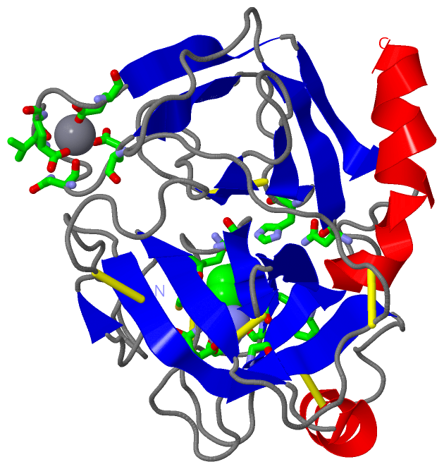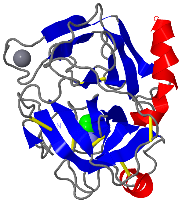 | | GO:0004252 | | serine-type endopeptidase activity | | Catalysis of the hydrolysis of internal, alpha-peptide bonds in a polypeptide chain by a catalytic mechanism that involves a catalytic triad consisting of a serine nucleophile that is activated by a proton relay involving an acidic residue (e.g. aspartate or glutamate) and a basic residue (usually histidine). |